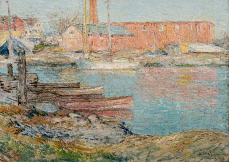 Childe Hassam, The Red Mill, Cos Cob, 1896. Oil on canvas. Greenwich Historical Society, Museum Purchase with Funds from Susan and Jim Larkin, Sally and Larry Lawrence, Mr. and Mrs. Peter L. Malkin, Debbie and Russ Reynolds, Reba and Dave Williams, and Lily Downing and David Yudain. Image: courtesy of Greenwich Historical Society