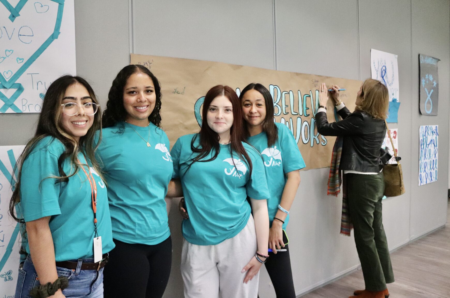 Artwork on display from students in YNET, a program that works to prevent teen dating violence and promote healthy relationships through peer education. Left to right: Prevention Coordinator for Harmony Project, Valentina Ramirez; with students Ariana Thompson, Lia Nastahowski and Rayne Williams. April 20, 2026 Photo: Leslie Yager