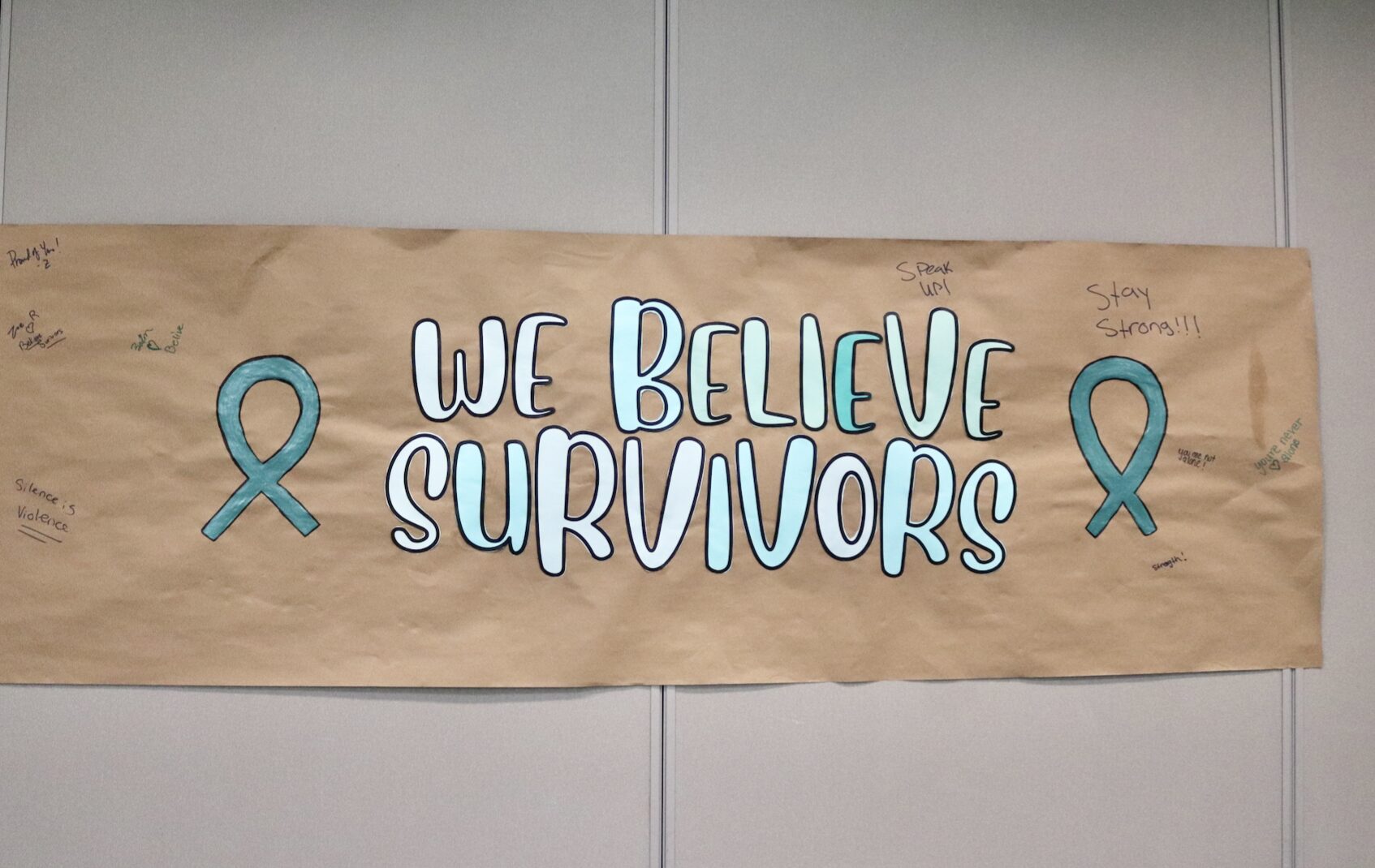 Guests signed a banner that said “We Believe Survivors” created by members of YNET, a student led club at Greenwich High School that is facilitated by the YWCA. The club is dedicated to preventing teen dating violence and promoting healthy relationship education. April 20, 2026 Photo: Leslie Yager