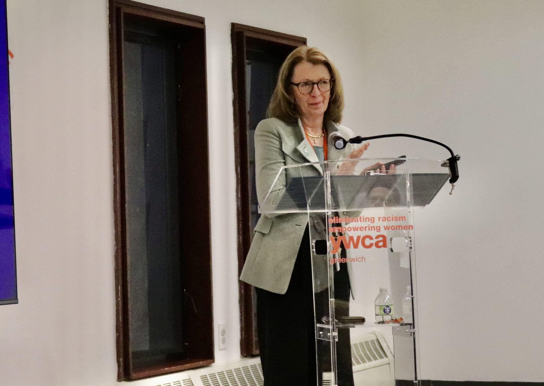 YWCA Greenwich President and CEO Mary Lee Kiernan greeted guests at The Harmony Project event to mark Sexual Assault Awareness Month in Greenwich. April 20, 2026 Photo: Leslie Yager