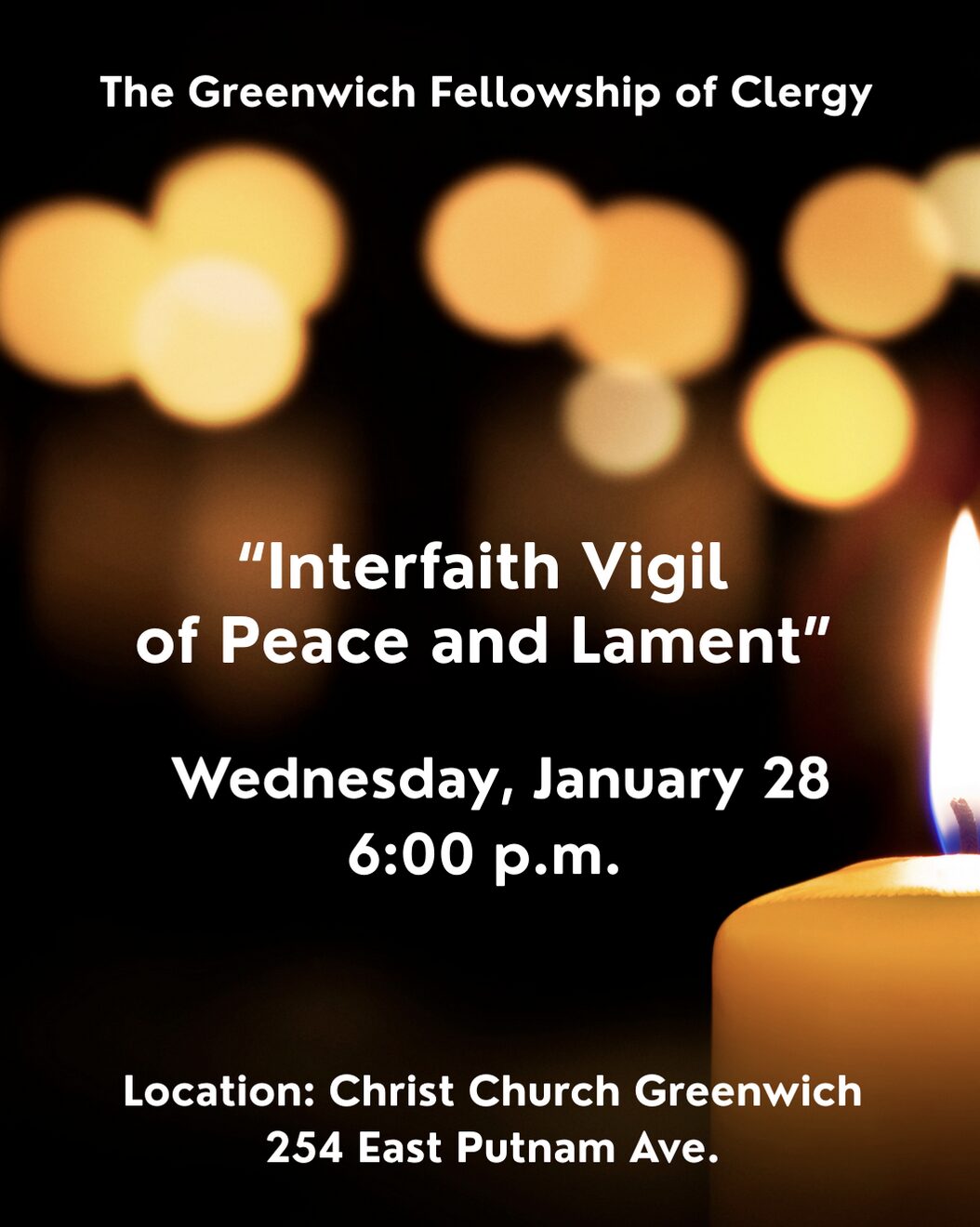 In response to recent events that have left many in our nation feeling unsettled and afraid, an Interfaith Candlelight Vigil of Peace and Lament, will be hosted by The Greenwich Fellowship of Clergy on Wednesday, January 28, from 6:00-6:45pm at Christ Church, 254 East Putnam Avenue, Greenwich, CT.
