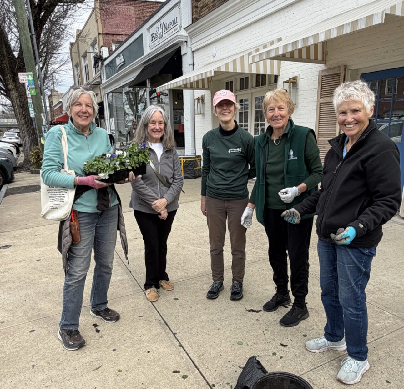 Garden Club of Old Greenwich volunteers gather after transforming flower pots lining the village sidewalks to welcome spring. Pictured: Ros Brady, Karin Nye, Marilyn Derr, Susi Orbanowski, Civic Committee Chair, and Angelika Streidt.