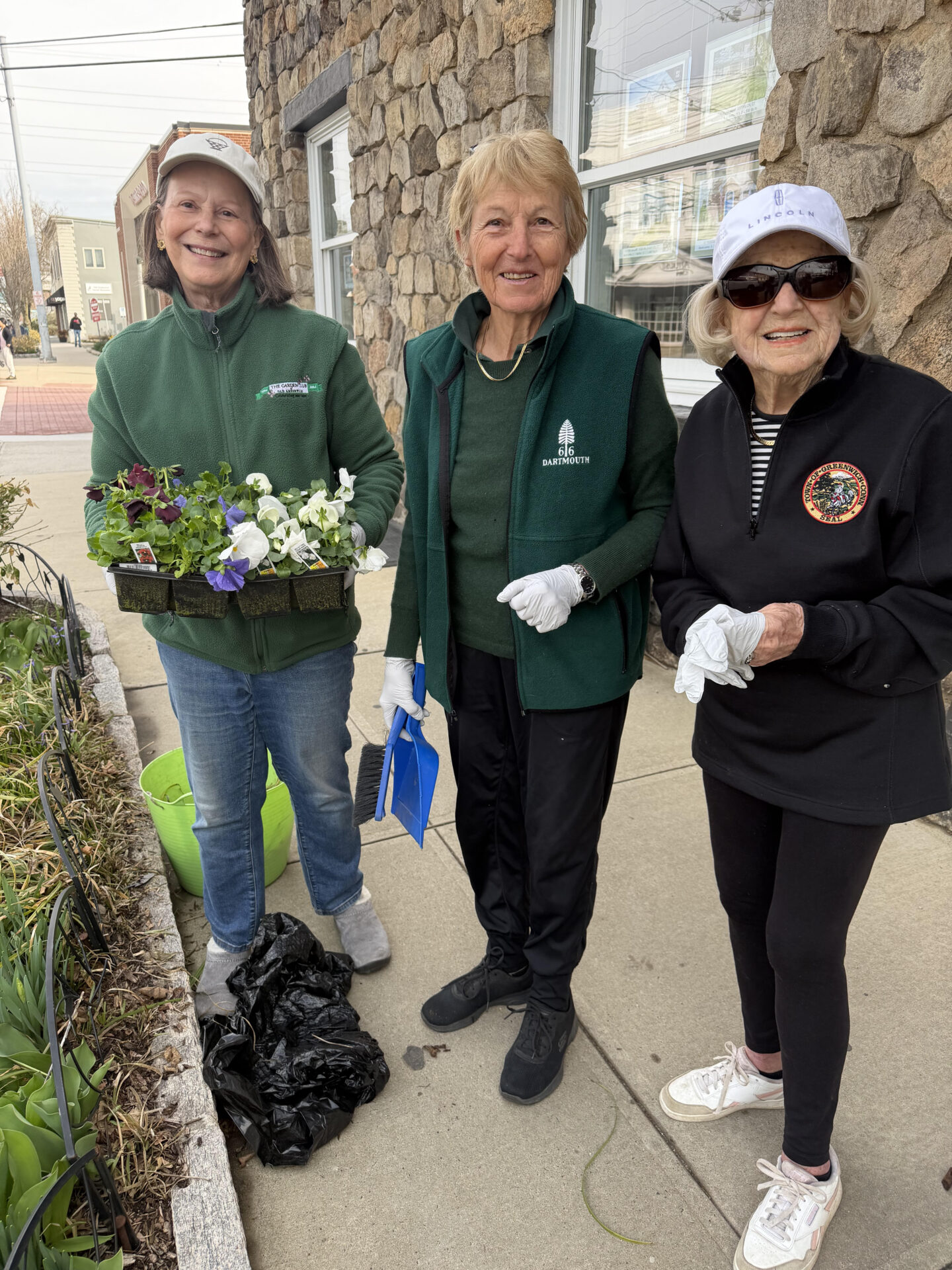 Pansy planting Betsy Kreuter, Vice Chair, & Susi Orbanowski, Chair of the Civic Committee of the Garden Club of Old Greenwich, and veteran gardener Helen DeLago getting ready to line the village sidewalks with hardy pansies in patriotic red, white and blue.