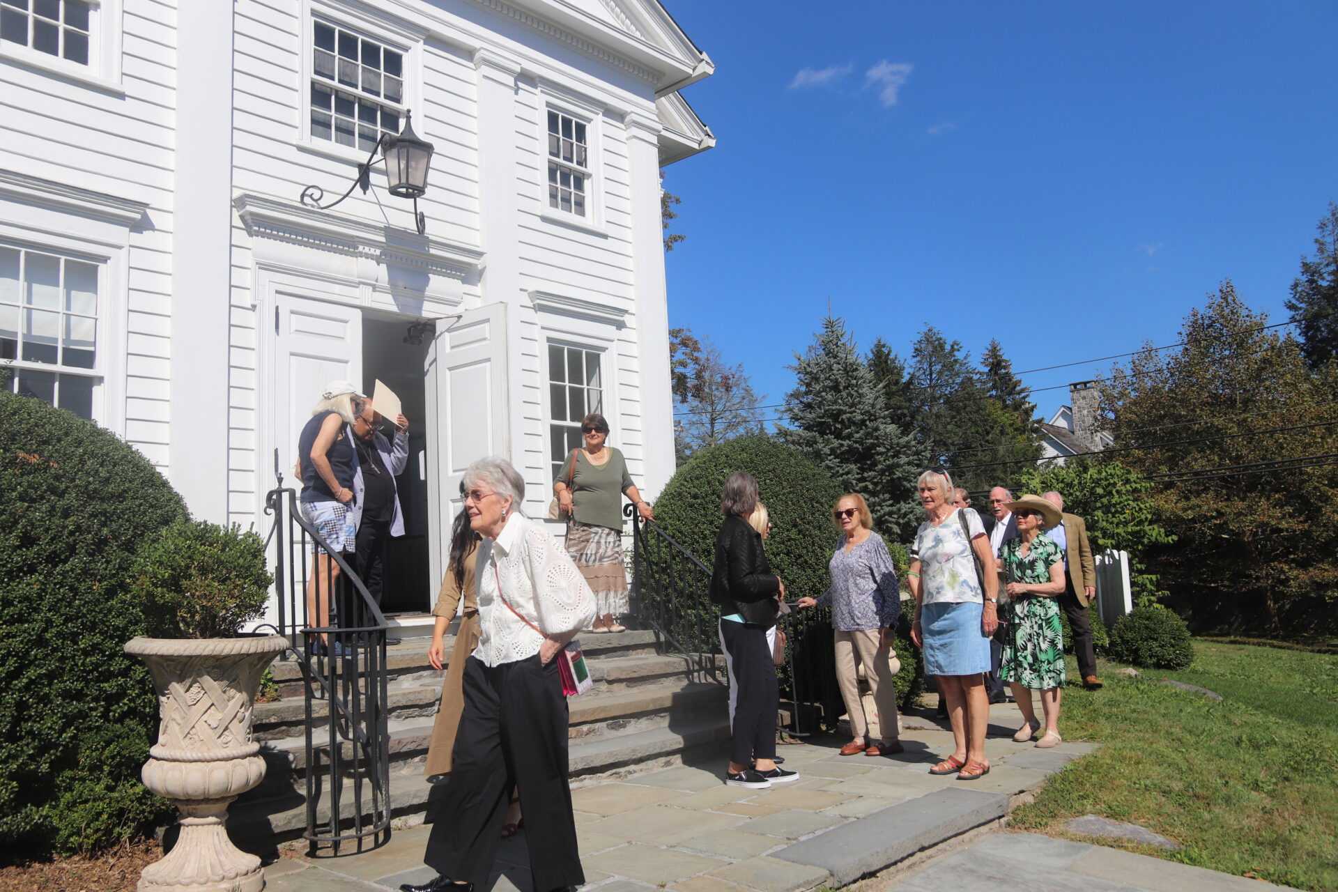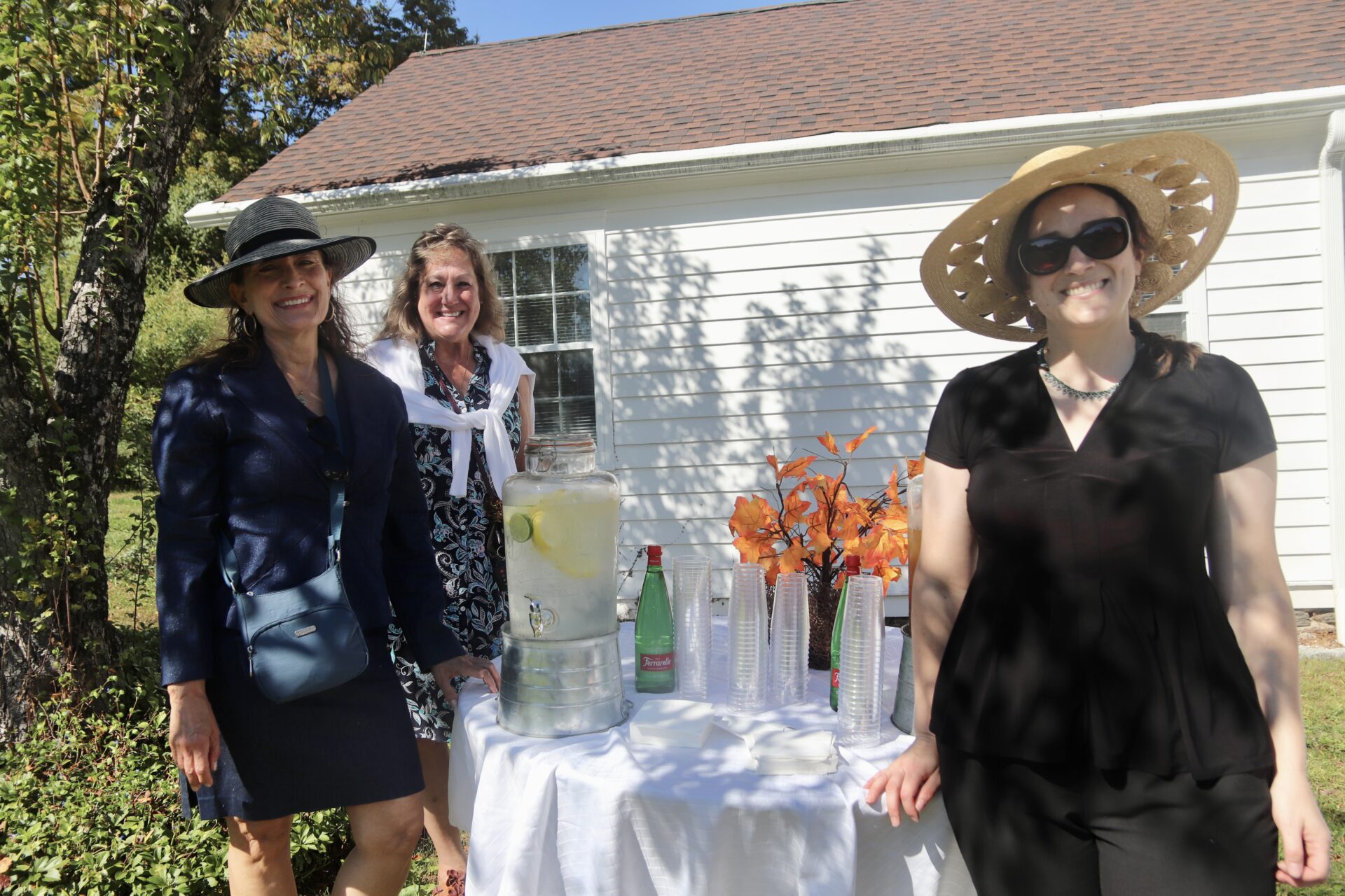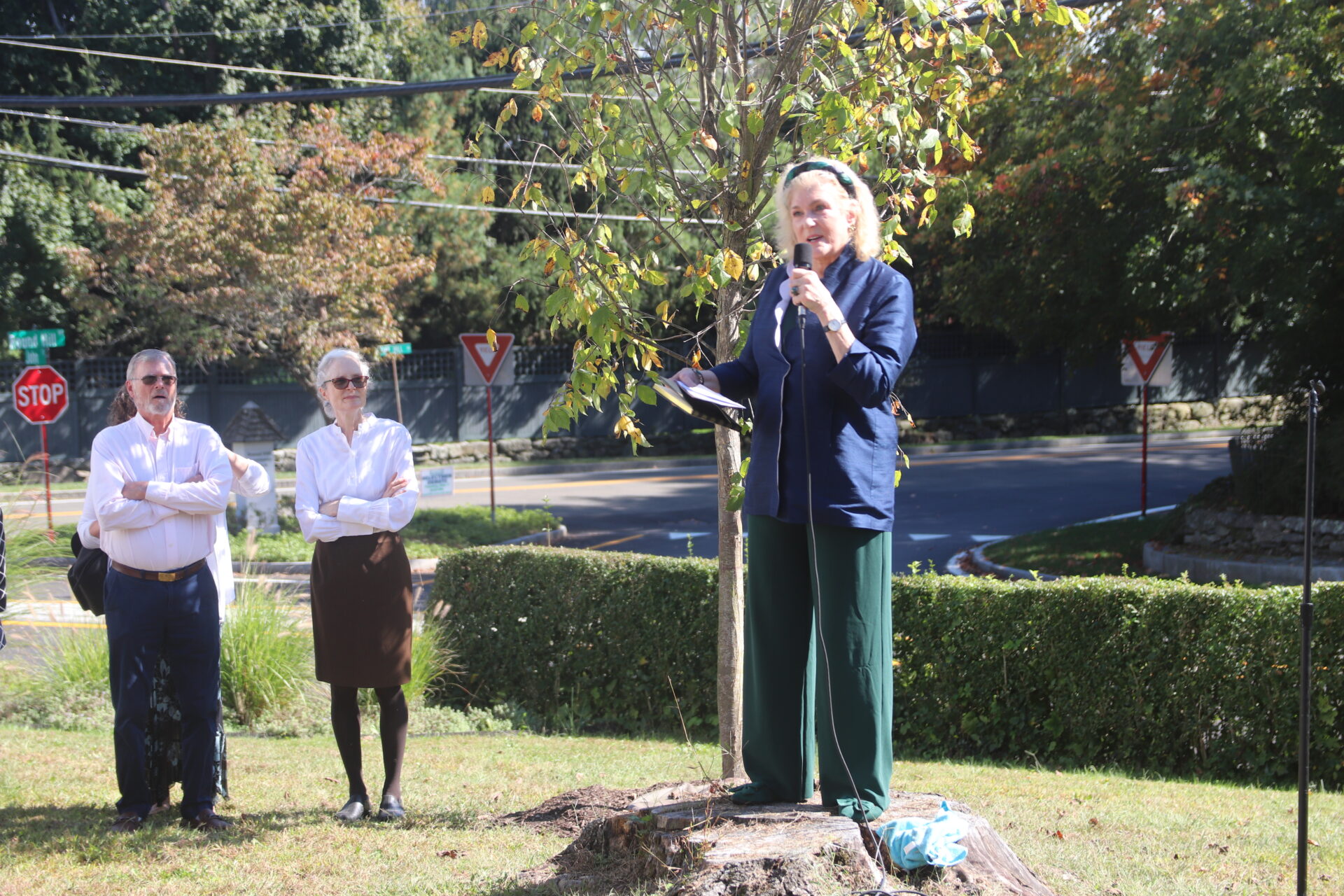 Former Tree Conservancy President, Cheryl Dunson, with Arboretum Curator of the Greenwich Townwide Arboretum for the Greenwich Tree Conservancy, Lisa Beebe and GTC executive director Kate Dzikiewicz at the dedication of a Valley Forge Elm tree in honor of John R. Conte Jr at First Church of Round Hill. Setp 28, 2025 Photo: Leslie Yager