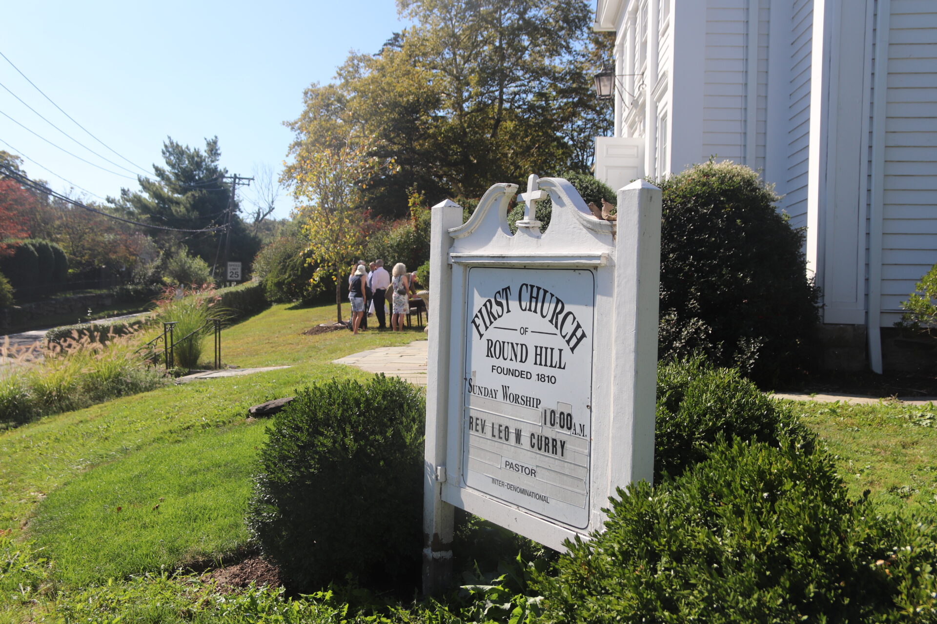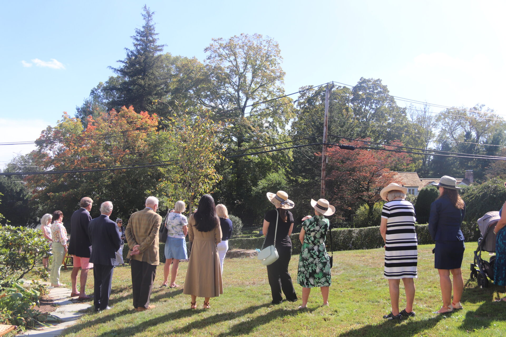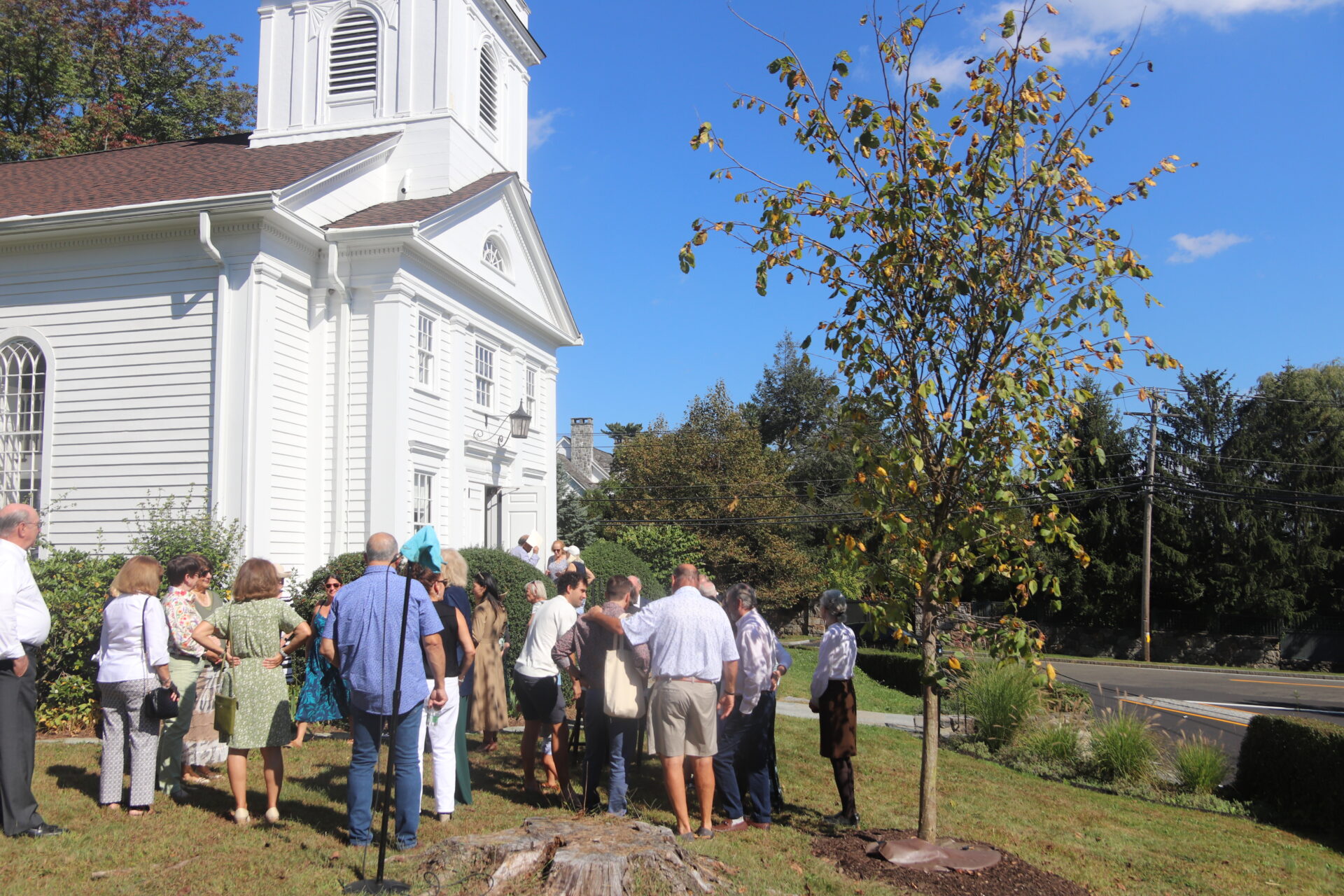 A group gathered at First Church of Round Hill for the dedication of a newly planted Valley Forge Elm Tree in honor of John R. Conte Jr. Sept 28, 2025 Photo: Leslie Yager