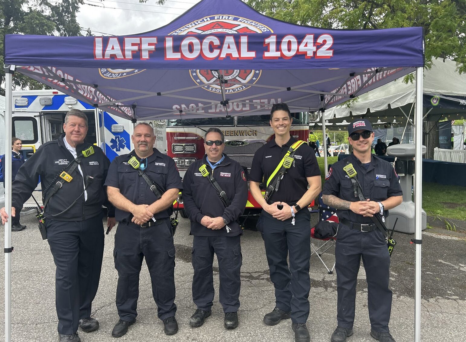 Greenwich Firefighters by the first aid area at the Greenwich Town Party, May 24, 2025.  Photo: Sydney Floch