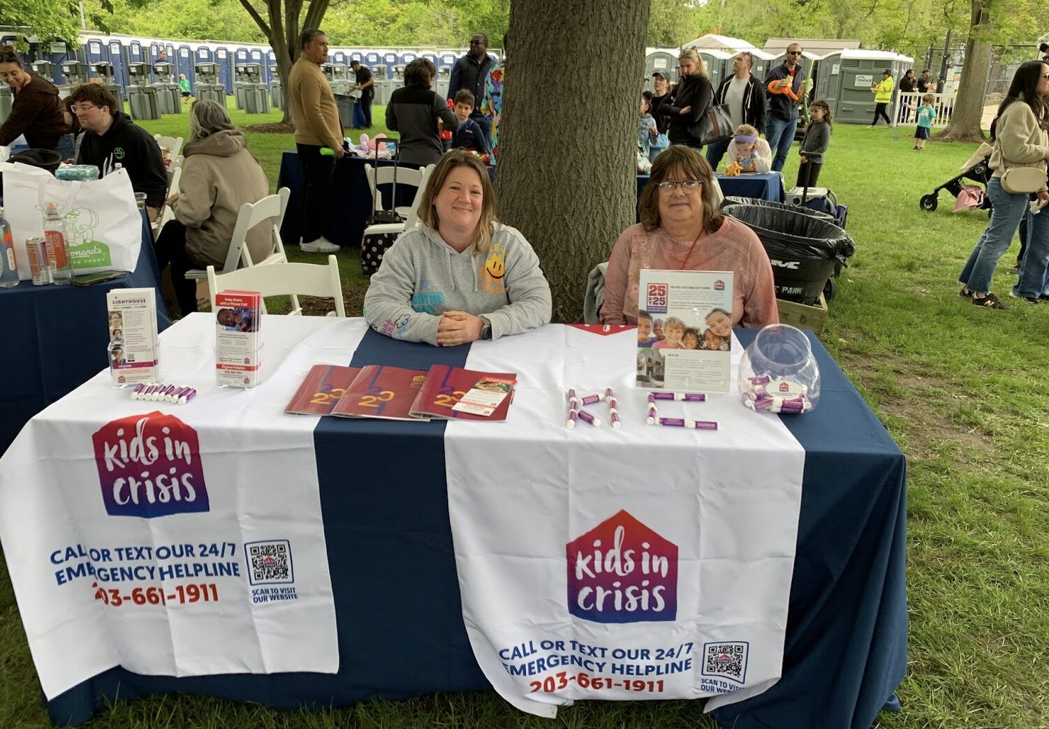 Ashley Chimblo and Susan Curcuruto gave out informational pamphlets and goodie bags at the Kids in Crisis table during the Greenwich Town Party, May 24, 2025. Photo: Sydney Floch