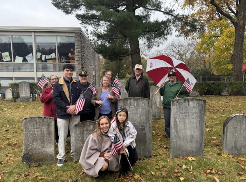 In recognition of Veterans Day, the Mary Bush Chapter of the Children of the American Revolution, sponsored by the Putnam Hill Chapter of the Daughters of the American Revolution, placed American flags on the graves of Revolutionary War soldiers at Christ Church Cemetery on November 9, 2025.