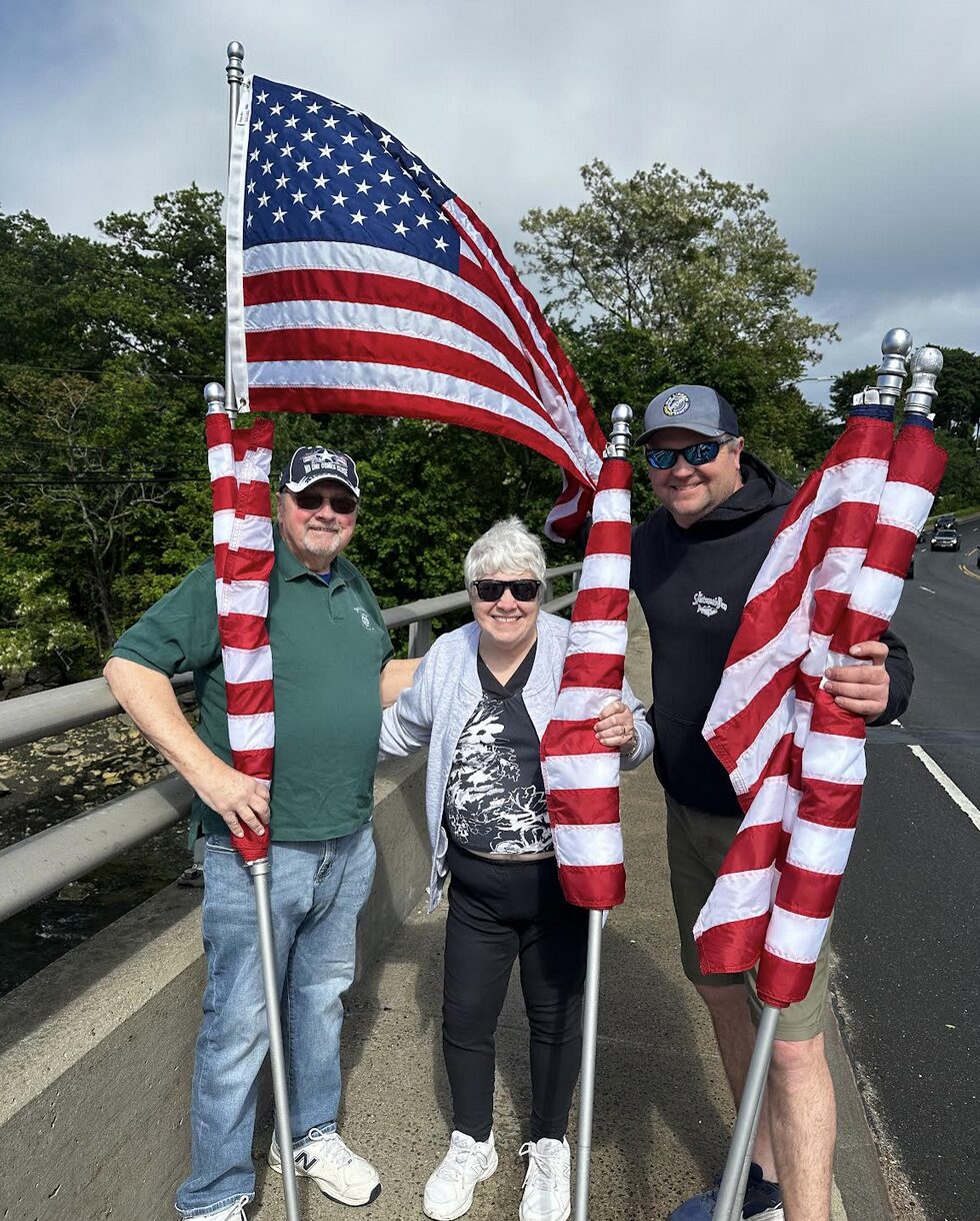 Cos Cob Vol Fire Department Assistant Chief Billy Ingraham with Joseph and Barbara Havranek with American flags to install on the Dave Theis Bridge connecting Cos Cob to Riverside on Putnam Ave. Contributed photo
