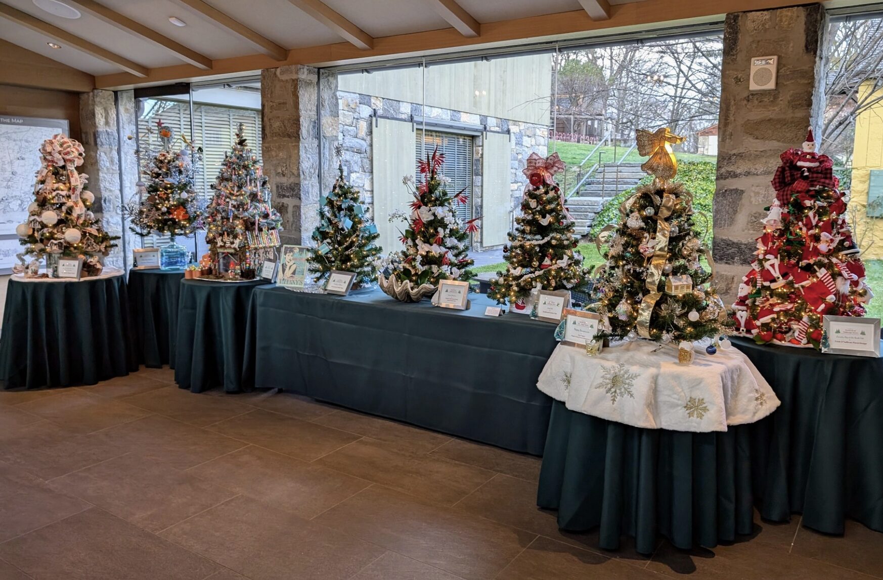 Trees on display for auction at Festival of Tabletop Trees in Greenwich Historical Society’s lobby. Photo courtesy Greenwich Historical Society