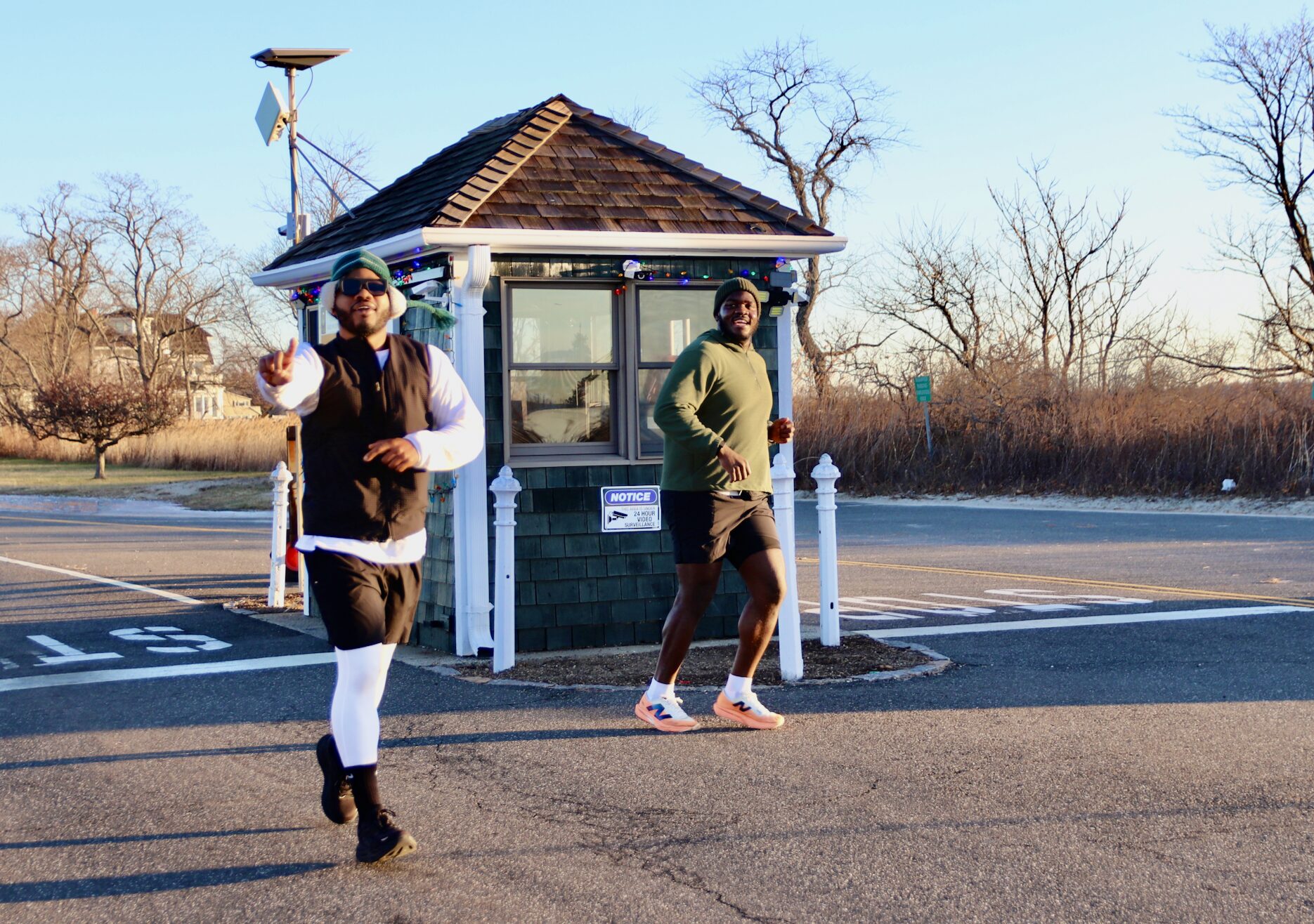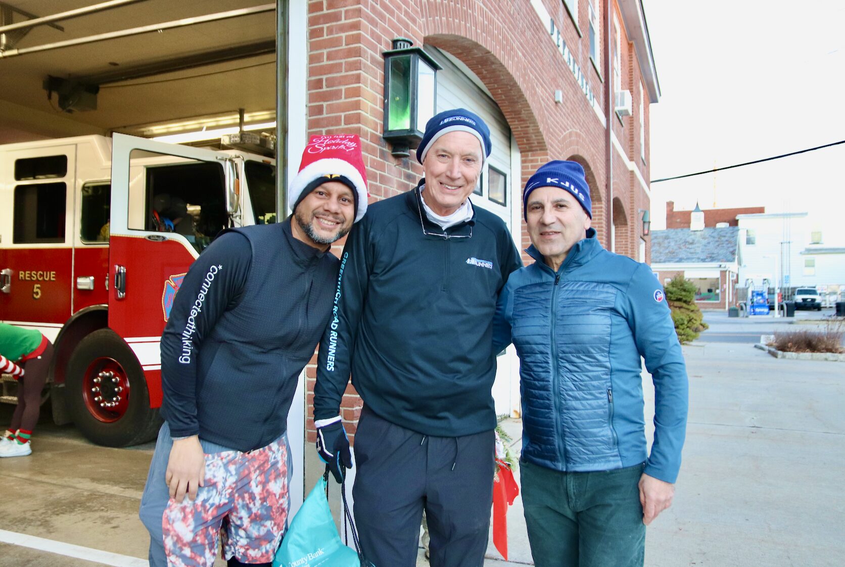 Three of Greenwich Road Runners directors Will Keown, Ric Wellington and Kiyan Asgari before the Jingle Bell Holiday Run in Old Greenwich. Dec 20, 2025 Photo: Leslie Yager