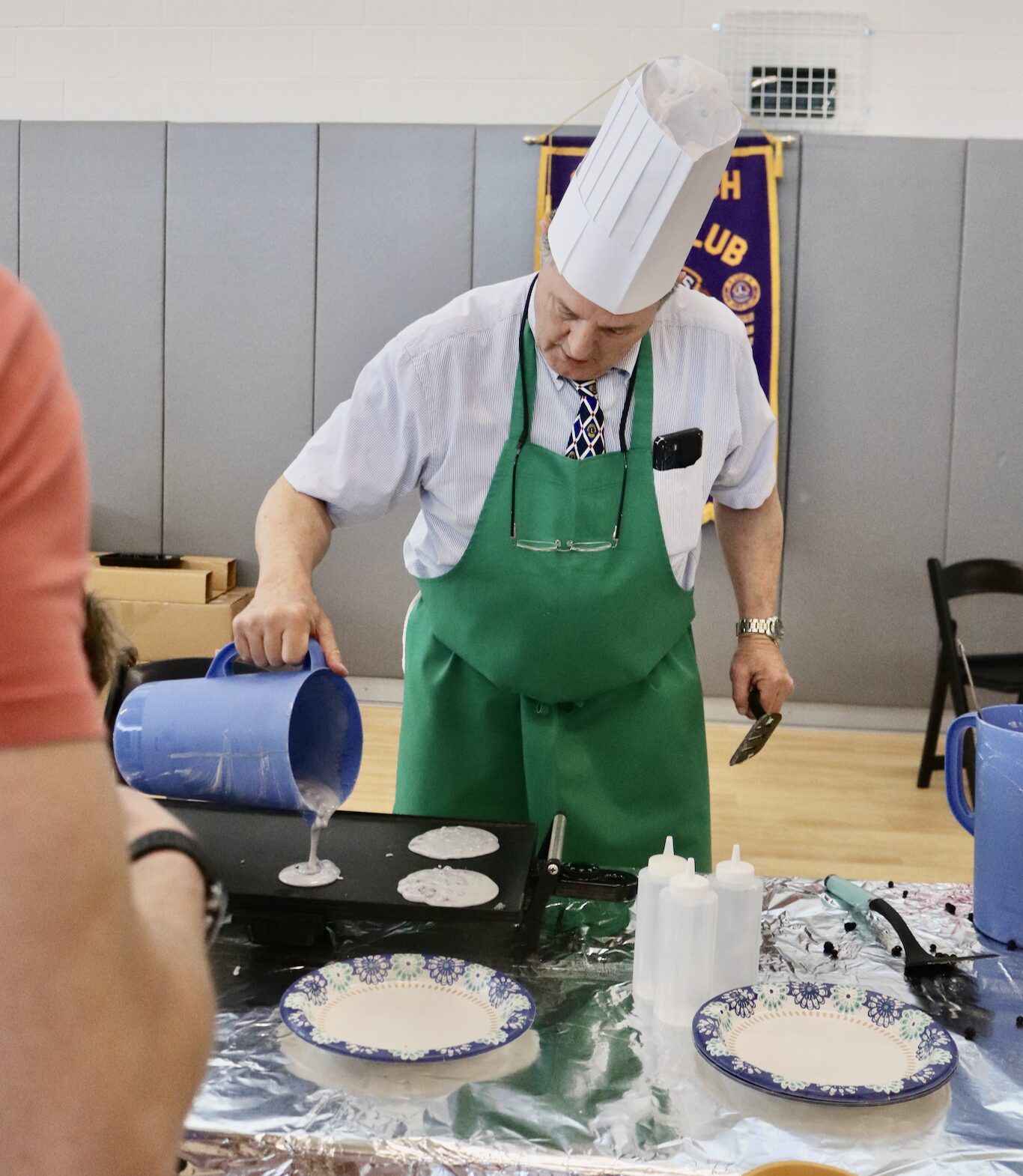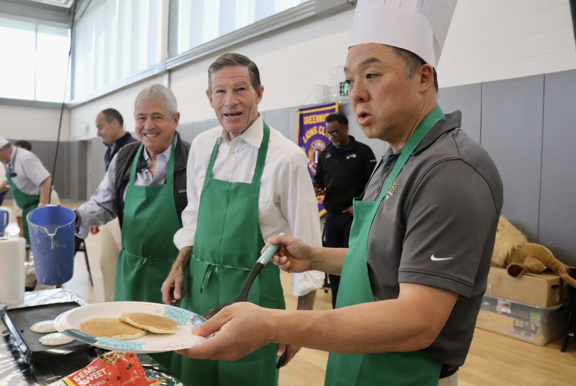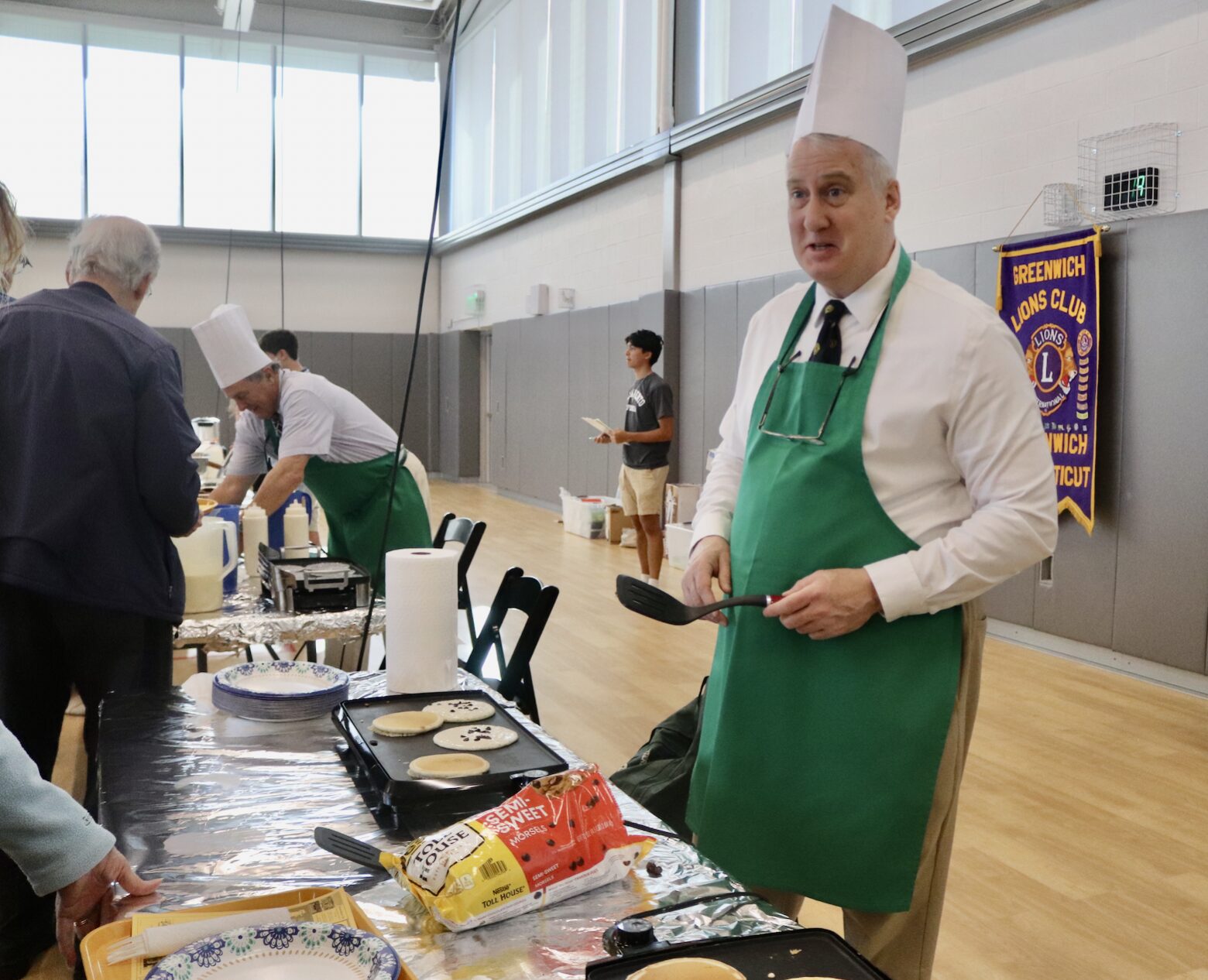 Flipping chocolate chip pancakes at the Greenwich Lions Club annual pancake breakfast at the Cohen Eastern Greenwich Civic Center. April 18, 2026 Photo: Leslie Yager