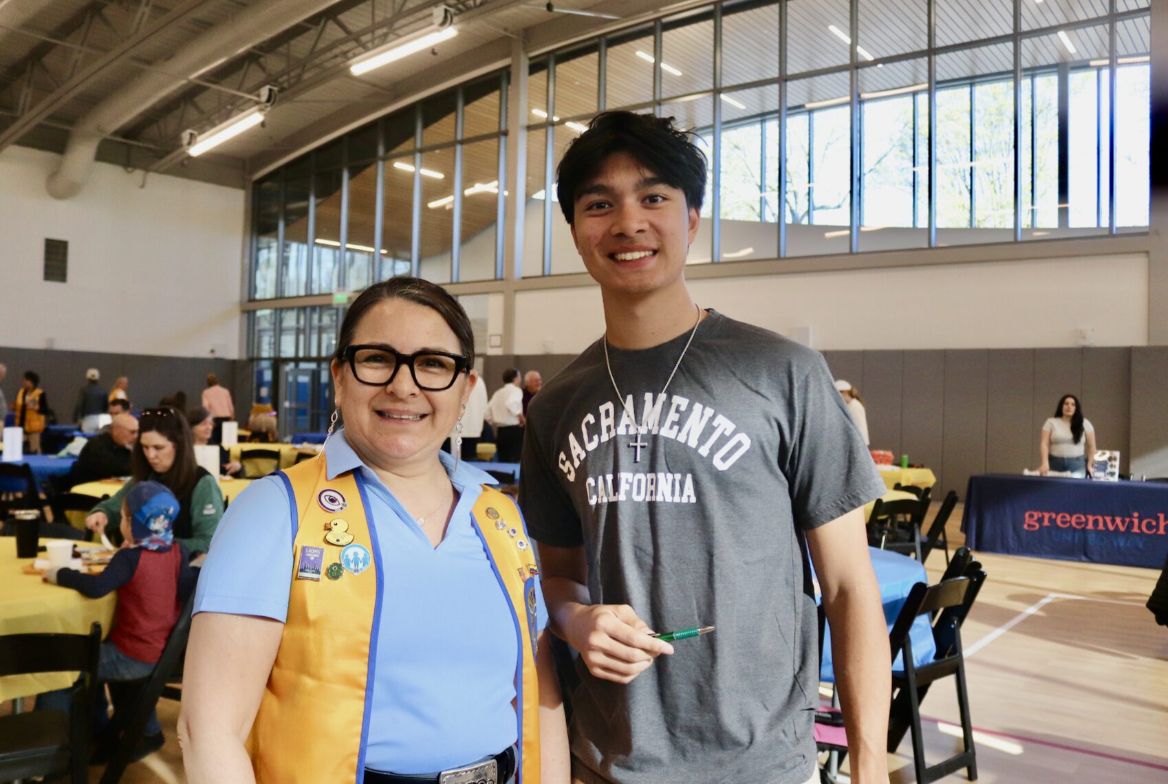 Greenwich Lions Clubs Nora Yanet Parry with GHS senior TJ Smith volunteering at at the Greenwich Lions Club annual pancake breakfast at the Cohen Eastern Greenwich Civic Center. April 18, 2026 Photo: Leslie Yager