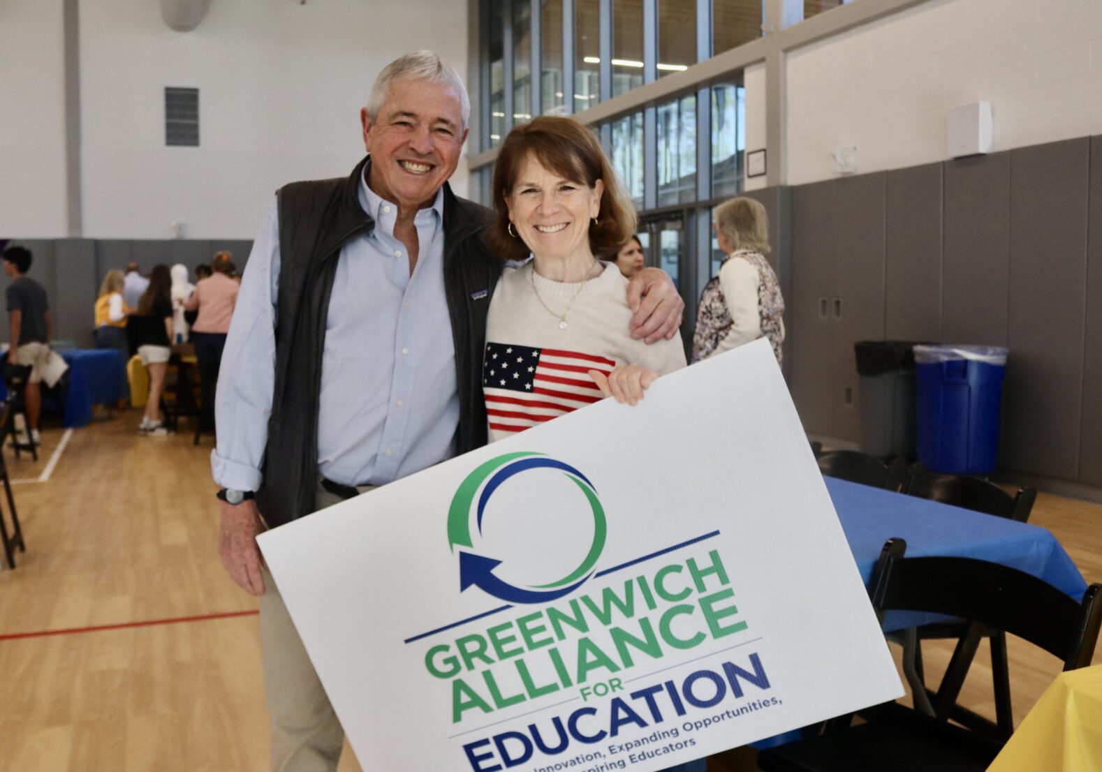 State Rep Hector Arzeno (D-151) with Julie Faryniarz from the Greenwich Alliance for Education at the Greenwich Lions Club annual pancake breakfast. April 18, 2026 Photo: Leslie Yager