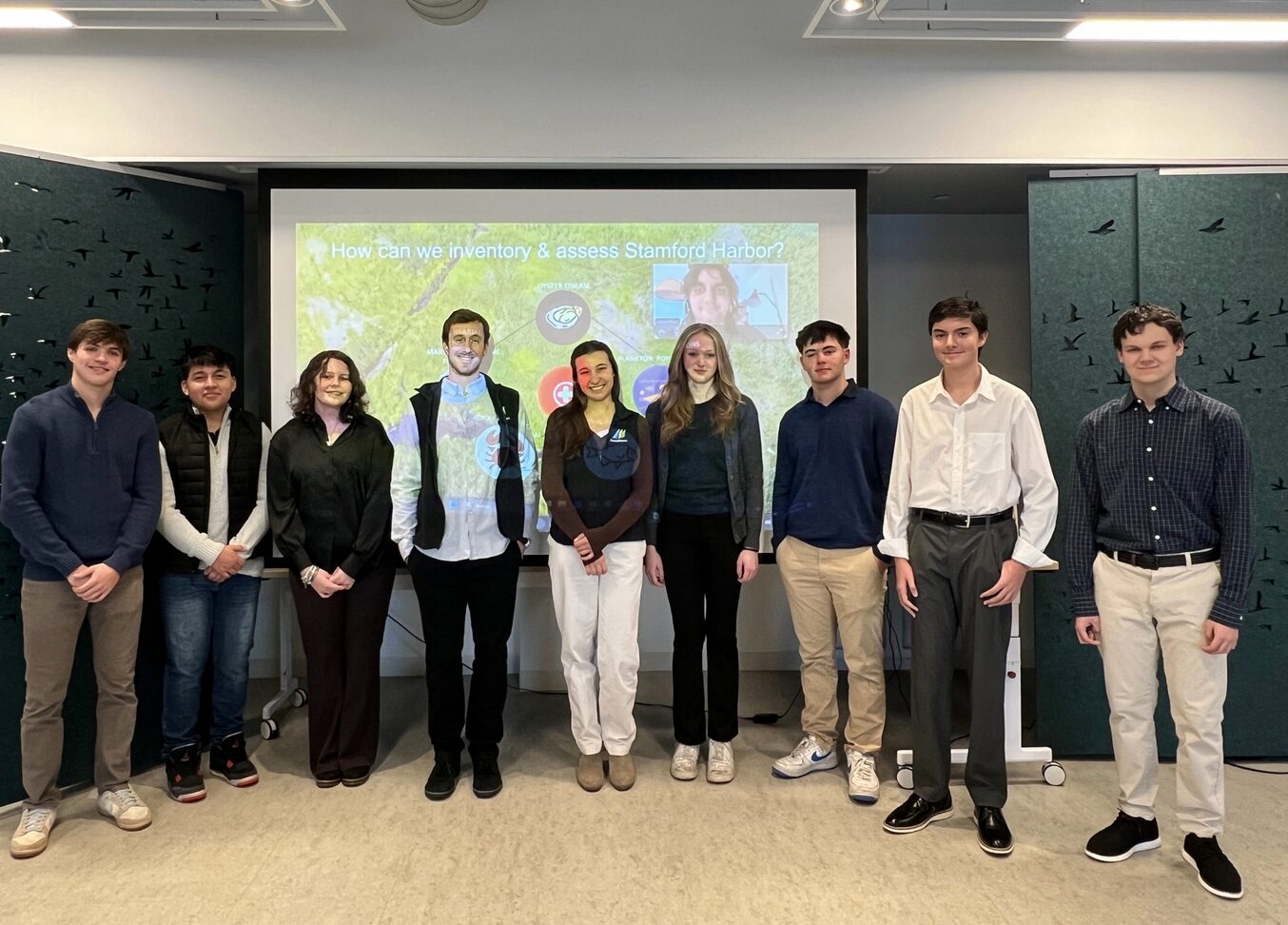 Theo, Andres, Kayla, Educator Tim, Educator Katie, Jenna, Xavier, Kai and Jack program stand for a photo before their presentations. Photo credit: SoundWaters