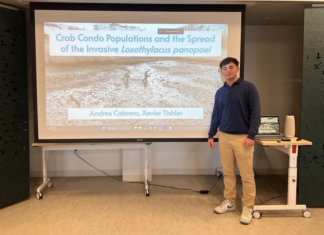 Xavier Tishler presenting his findings on crab condo populations. Photo credit: SoundWaters