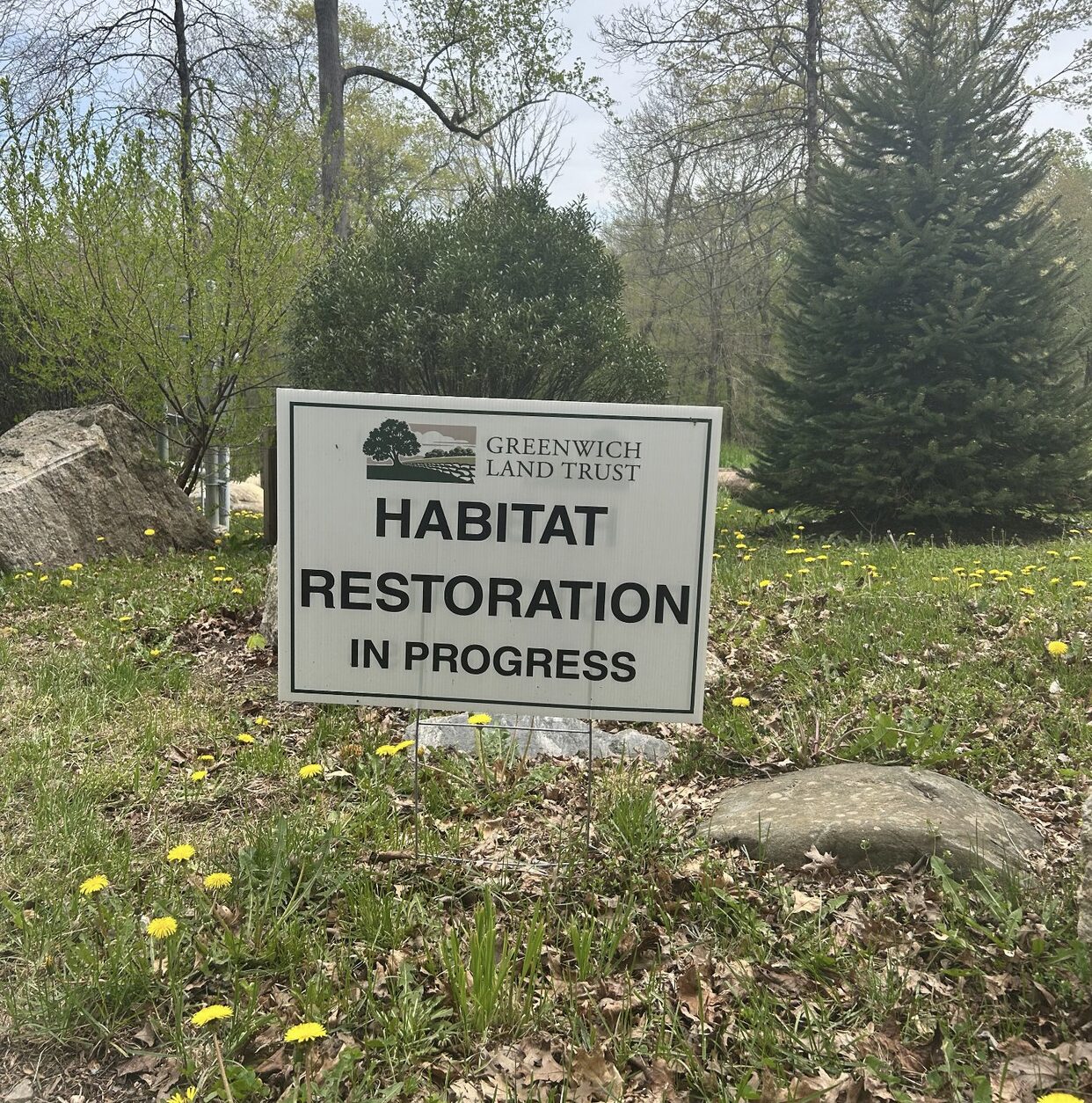 Habitat Restoration in Progress sign at our Converse Brook Preserve