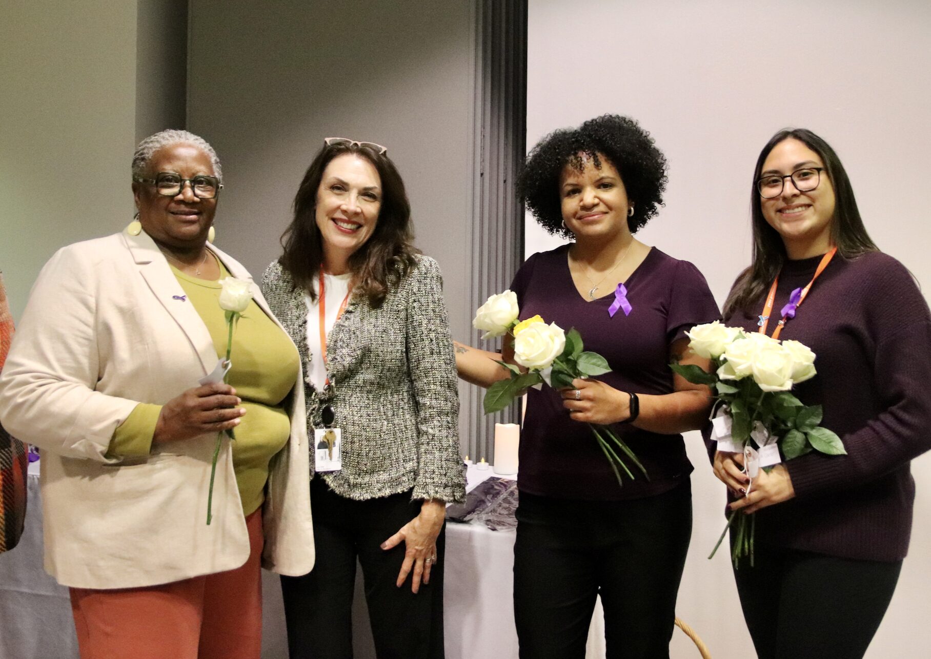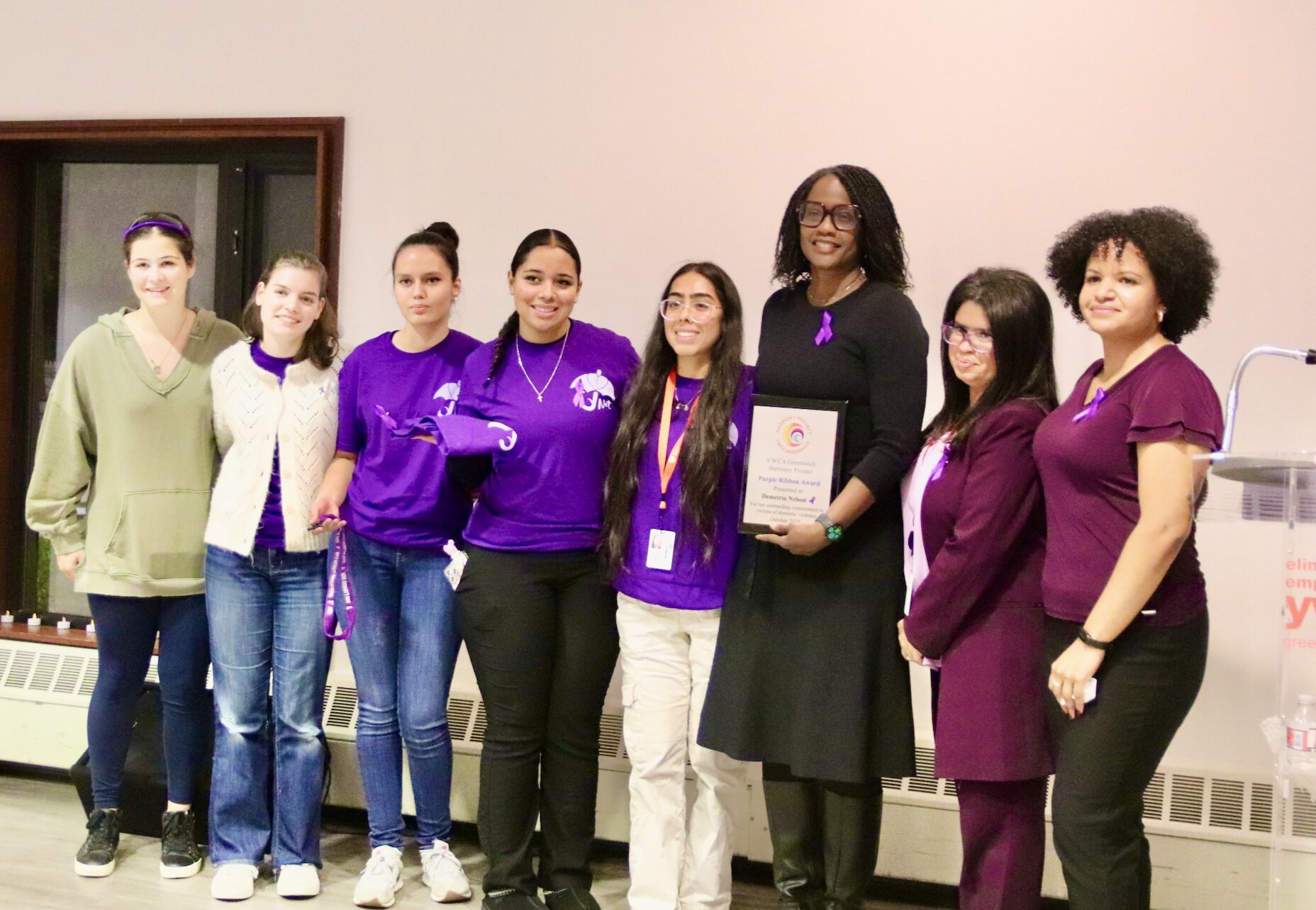 Members of YNET’s executive leadership committee, with violence prevention coordinator for Harmony Project, Valentina; purple ribbon honoree, Demetria Nelson; Harmony Project Director Jackie Collazo and Director of Programs, Harmony Project Jessie DiMuzio. Oct 21, 2025 Photo: Leslie Yager