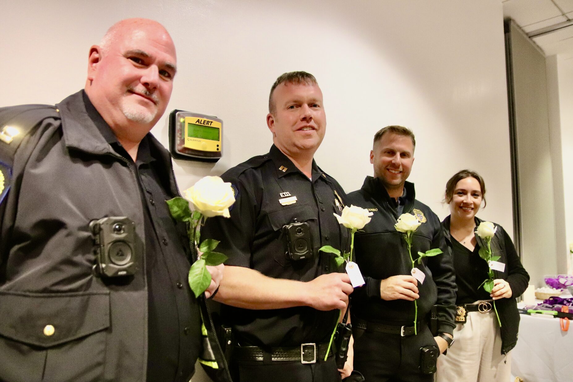 Captain Patrick Smyth, Lieutenant Eric Scorca, Sergeant Ryan Carino, Officer Sabrina Diaz at the YWCA Greenwich’s candlelight vigil and Purple Ribbon Award award to Demetria Nelson. Oct 21, 2025 Photo: Leslie Yager