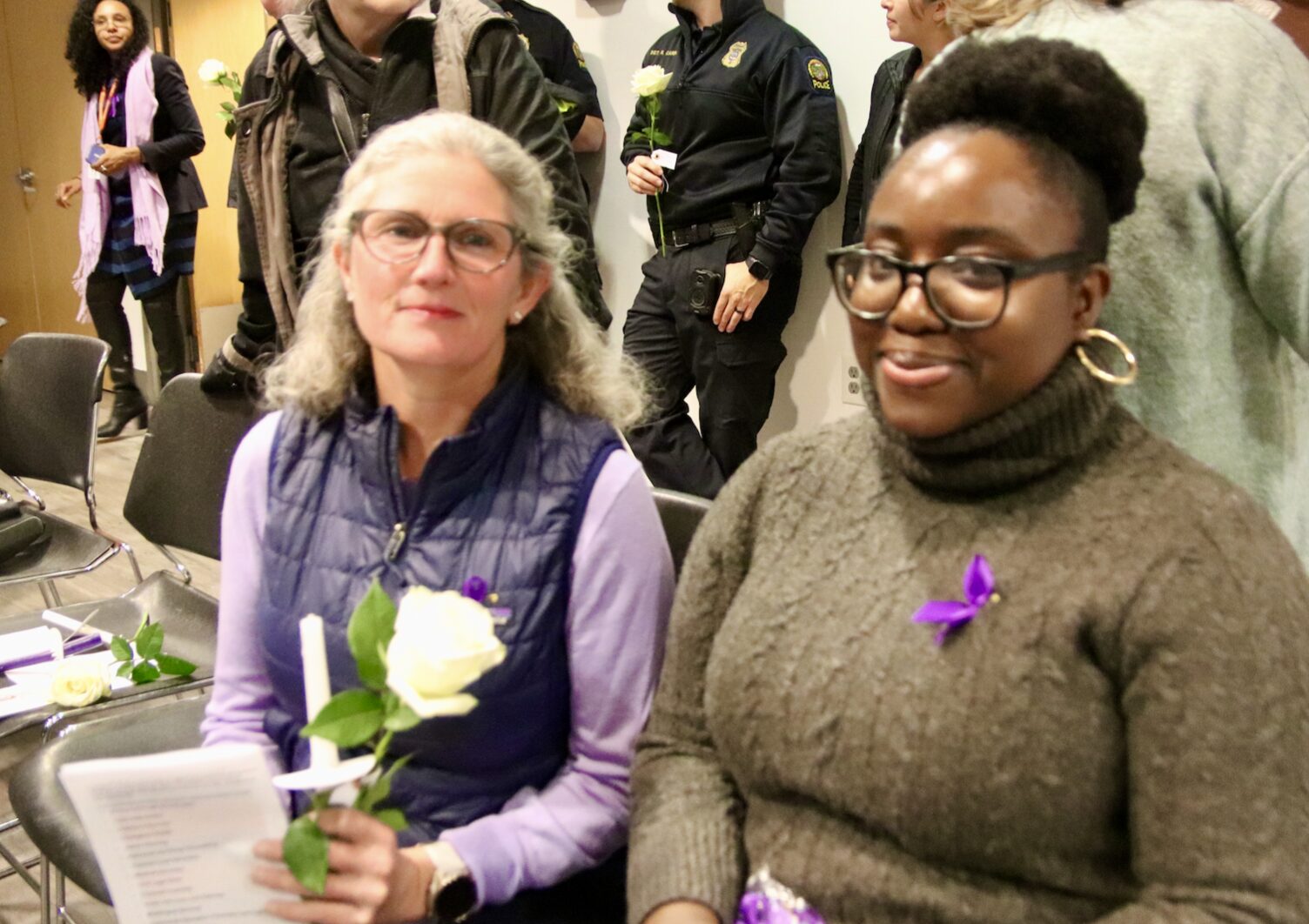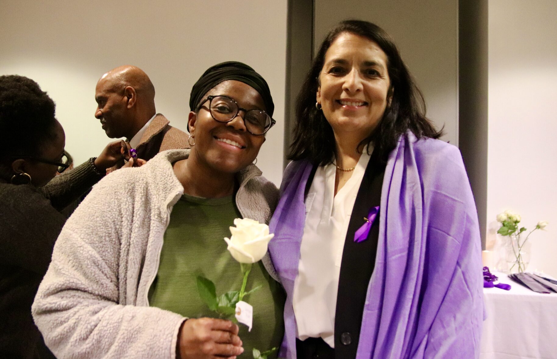 Rachel Khanna and YWCA Greenwich Director of the Center for Equity and Justice, Simone Quartay at the YWCA Greenwich’s candlelight vigil and Purple Ribbon Award award to Demetria Nelson. Oct 21, 2025 Photo: Leslie Yager
