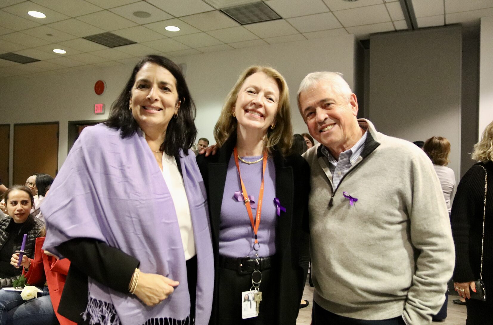 State Rep Tina Courpas (R-149), YWCA Greenwich President and CEO Mary Lee Kiernan and State Rep Hector Arzeno (D-151) at the YWCA Greenwich’s candlelight vigil and Purple Ribbon Award award to Demetria Nelson. Oct 21, 2025 Photo: Leslie Yager