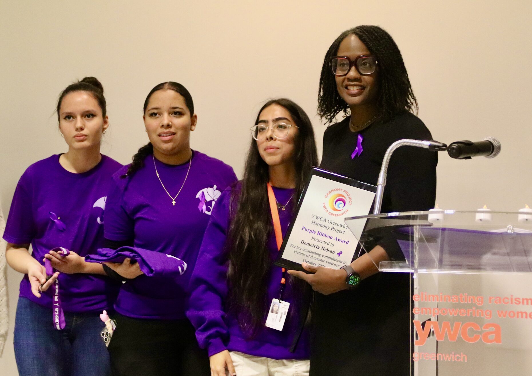 October is Domestic Violence Awareness Month. On Tuesday the YWCA Greenwich Harmony Project held their annual community candlelight vigil, where they also honored Demetria Nelson, LCSW, with their purple ribbon award.