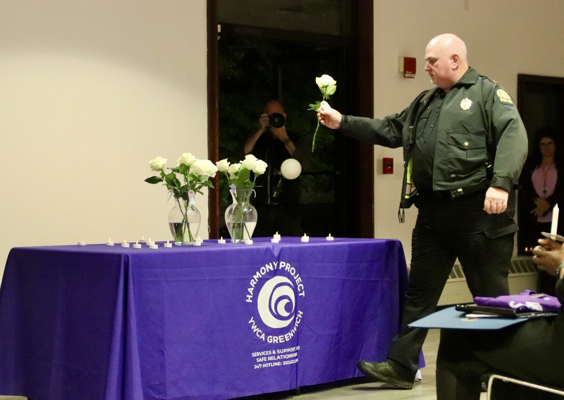 Greenwich Police Captain Patrick Smyth placed a rose after a name of a victim of domestic violence was announced. Oct 21, 2025 Photo: Leslie Yager