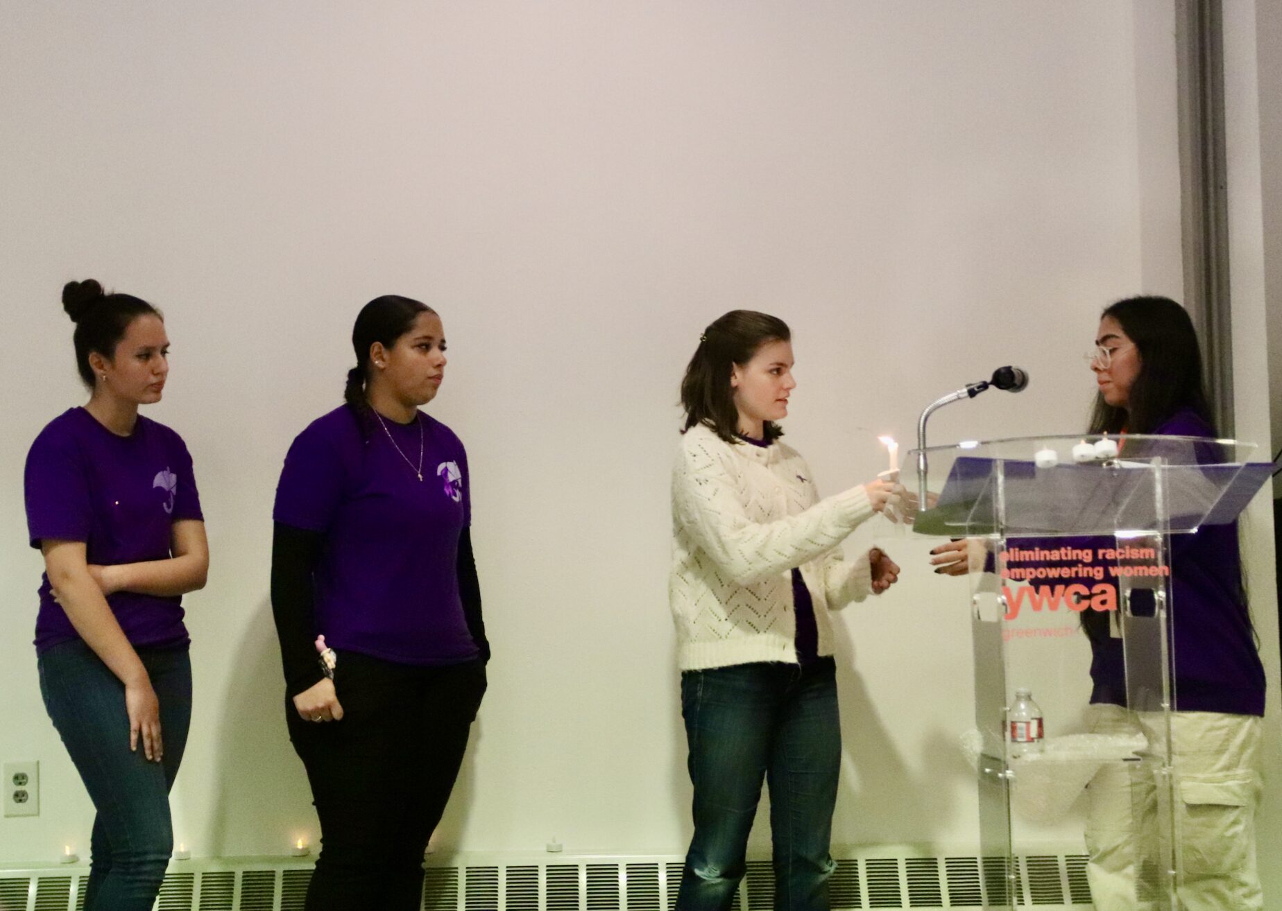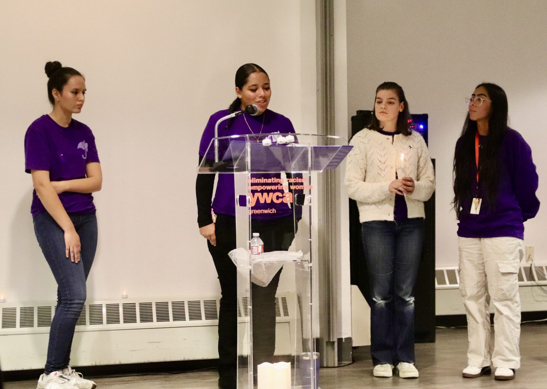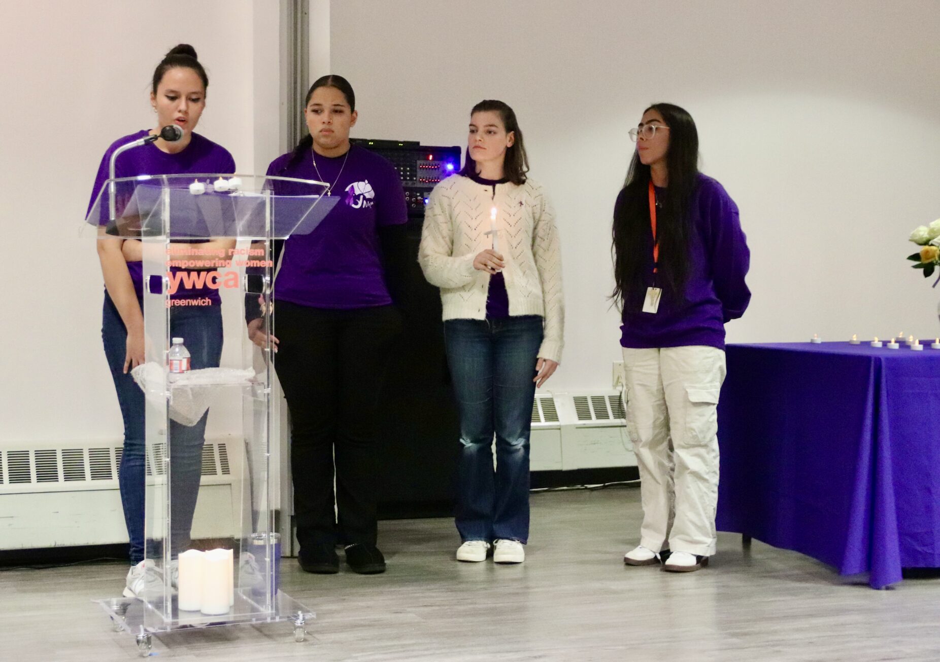 After the reading of names of those who lost their lives in the past year to domestic violence, members of student activism club at GHS sponsored by YWCA Greenwich called YNET the youth network.