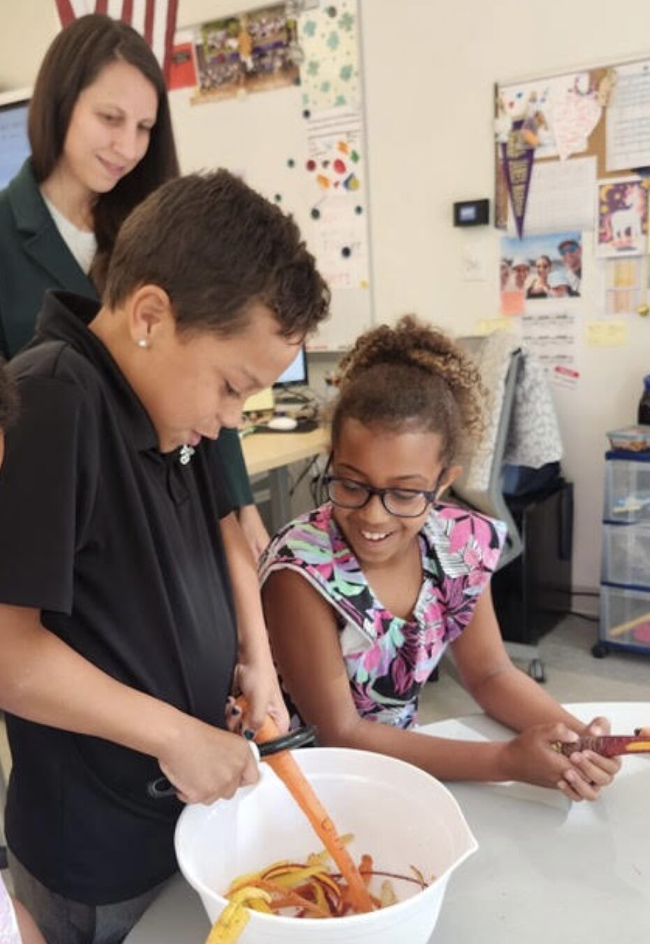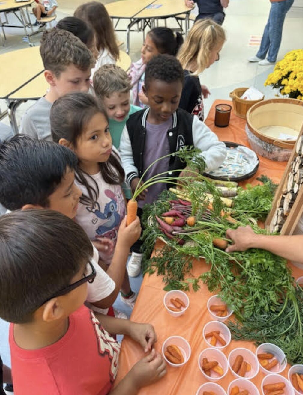 The day featured the carrot. Students juiced, made carrot ribbon salad, watched a carrot-top pesto demonstration and participated in a carrot taste test. (The raw carrot triumphed over the roasted one with a maple glaze!) Under the warm autumn sun, Farmer Liz from Fairgate Community Farm, a regenerative urban farm in Stamford, led the students in vegetable growing activities.