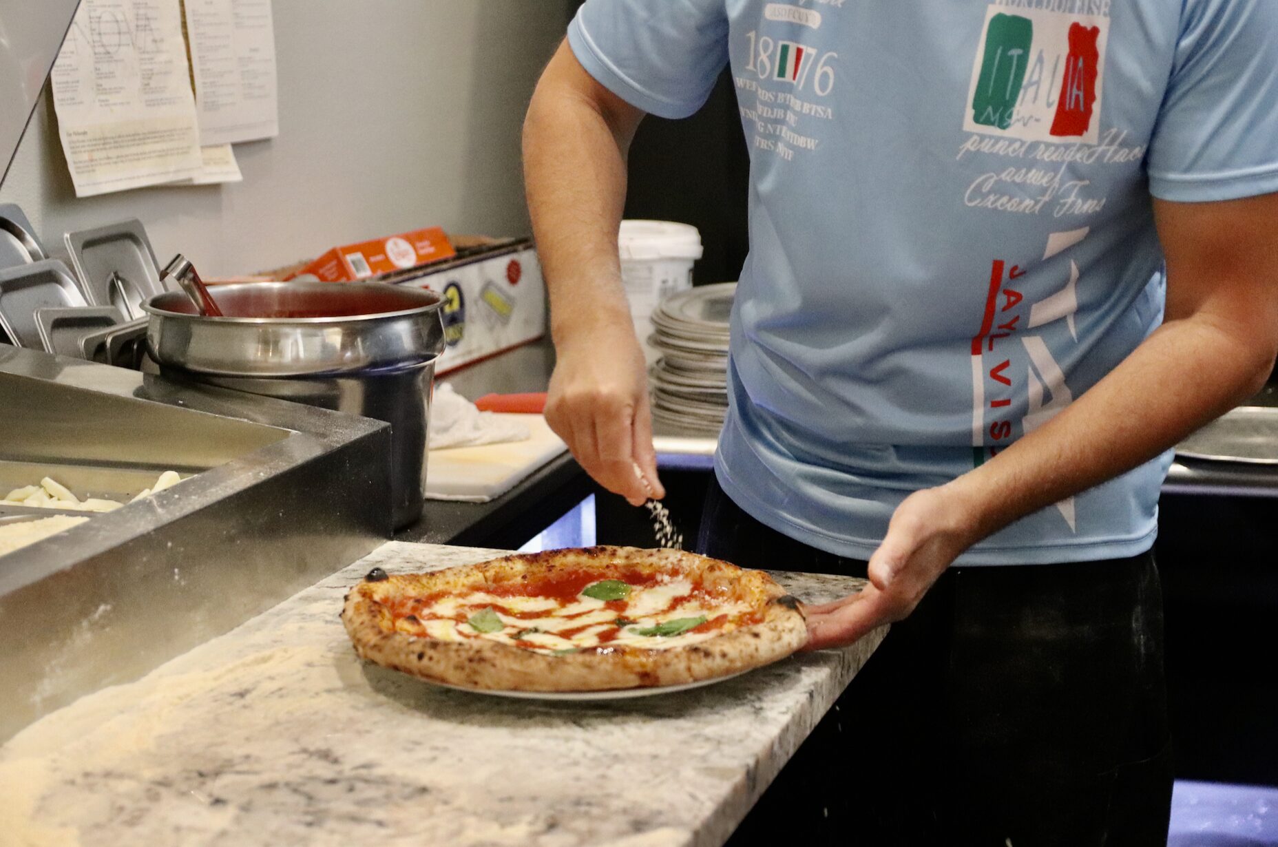 “The mozzarella is from Naples. The Prosciutto is from Parma,” he added as Flavio Garelli, the pizza master from Italy, moved swiftly to shape the pizza dough, add sauce, cheese and toppings at his busy work station.