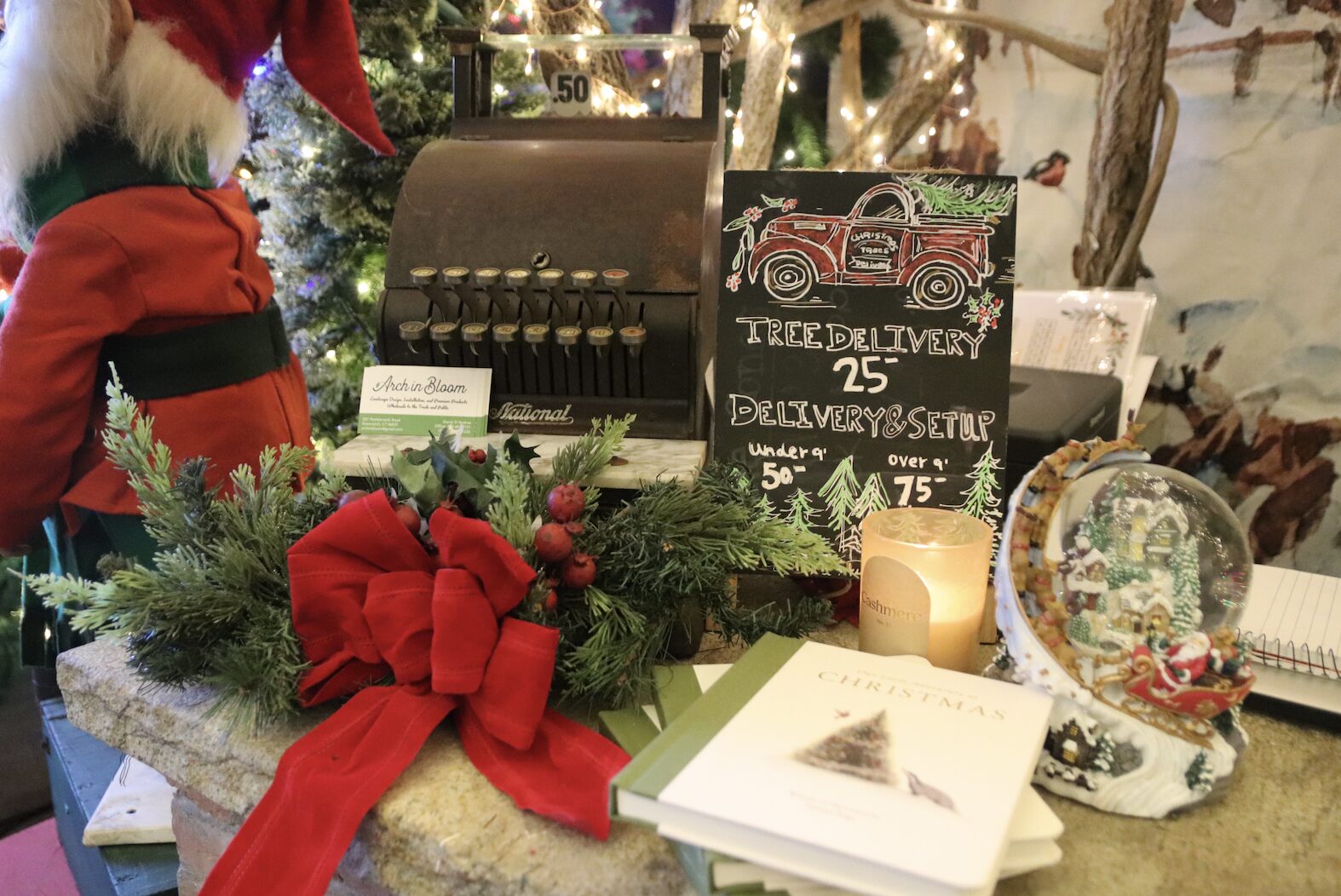 Derek D’Andrea and his crew at Arch in Bloom have created a winter wonderland that includes Christmas trees in a variety of sizes and types, as well as wreathes and garlands. All are fresh cut from a variety of sources.