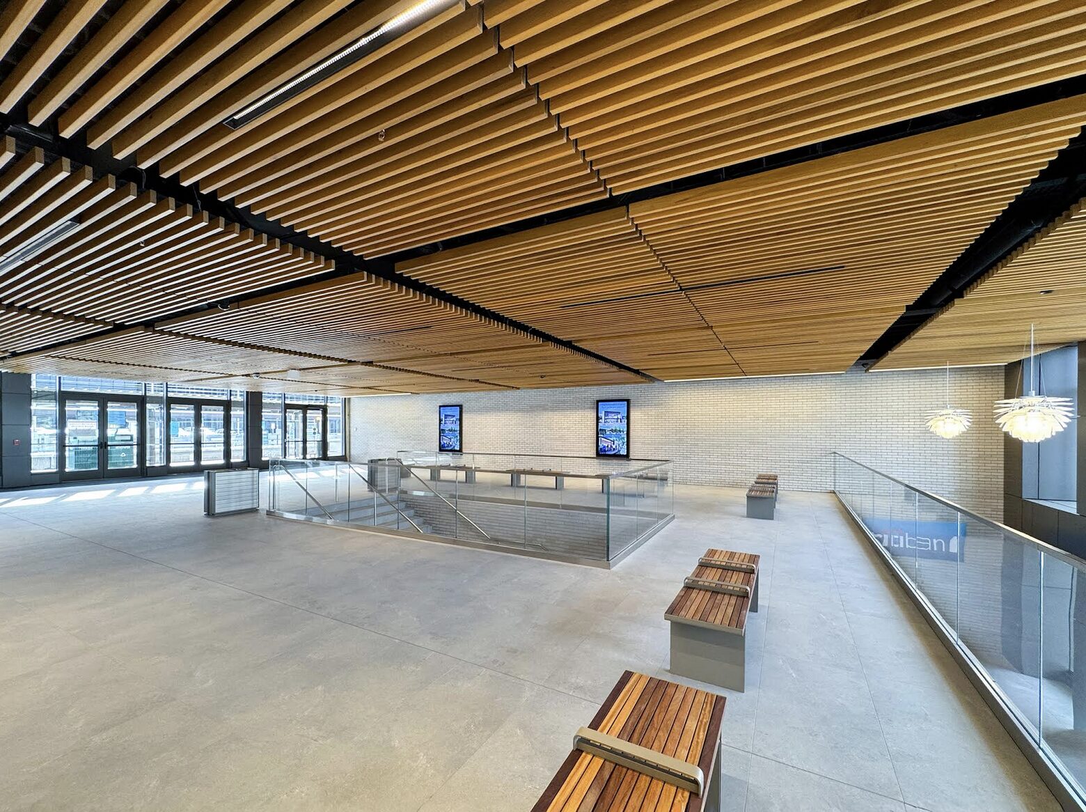 The comprehensive renovation enhances access and experience for commuters and visitors. As this phase is completed, improvements will include a new exterior facade, upgraded platform access, and new pedestrian pathways, with all sidewalks and curbing replaced from the Arch Street railroad bridge to the Steamboat Road railroad bridge, along with a new staircase at Steamboat Road. Inside the station, renovations include full-glass entrance facades, a new wood-slatted ceiling, designer lighting, upgraded restrooms, and new flooring, glass railings, signage, and a new elevator.