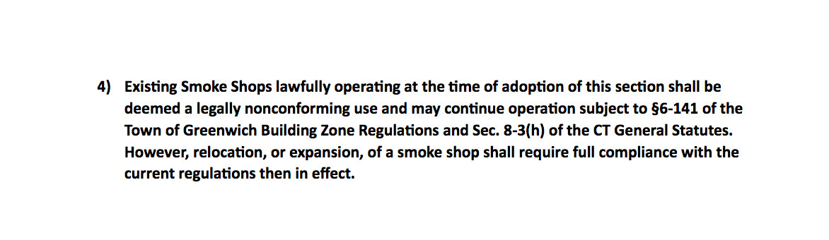 Heagney cited a federal district court case in 2023 that includes a definition of cigar stores for consideration in Greenwich’s new regulation, so premium cigar stores would be exempt from the proposed distance requirements.