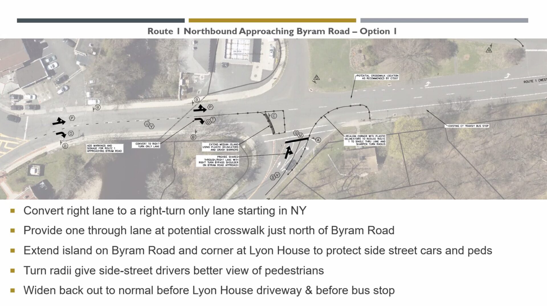 The quick build trial would use temporary elements like bollards, rubber tires and jersey barriers to create a right turn only lane coming from New York to turn onto Byram Rd and to narrow Rte 1 in either direction to one lane from two, reducing conflict points and serving as a traffic calming measure.