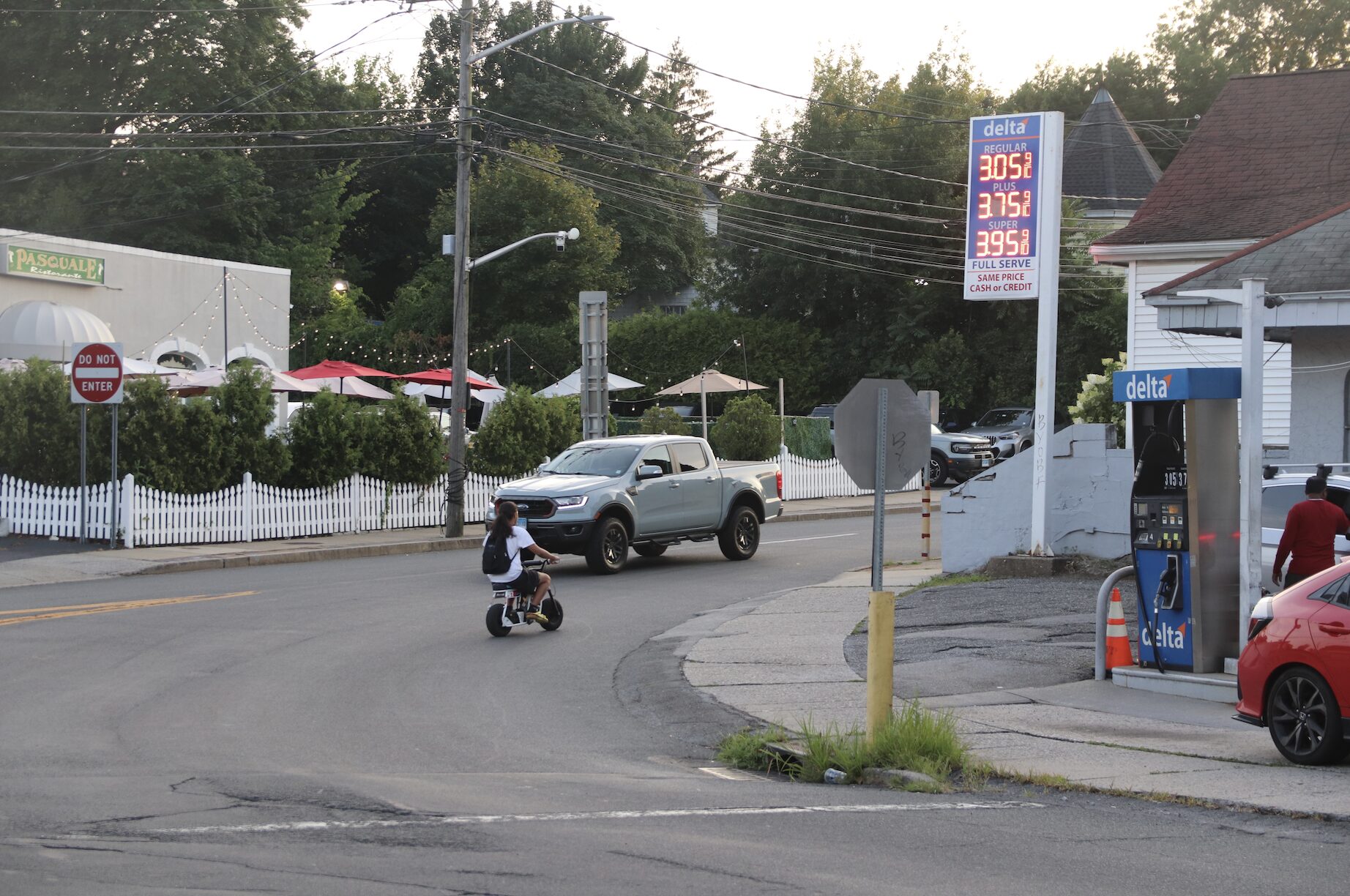 Driver on an electric moped heads against traffic in Port Chester near the Connecticut state line. July 24, 2025 Photo: Leslie Yager