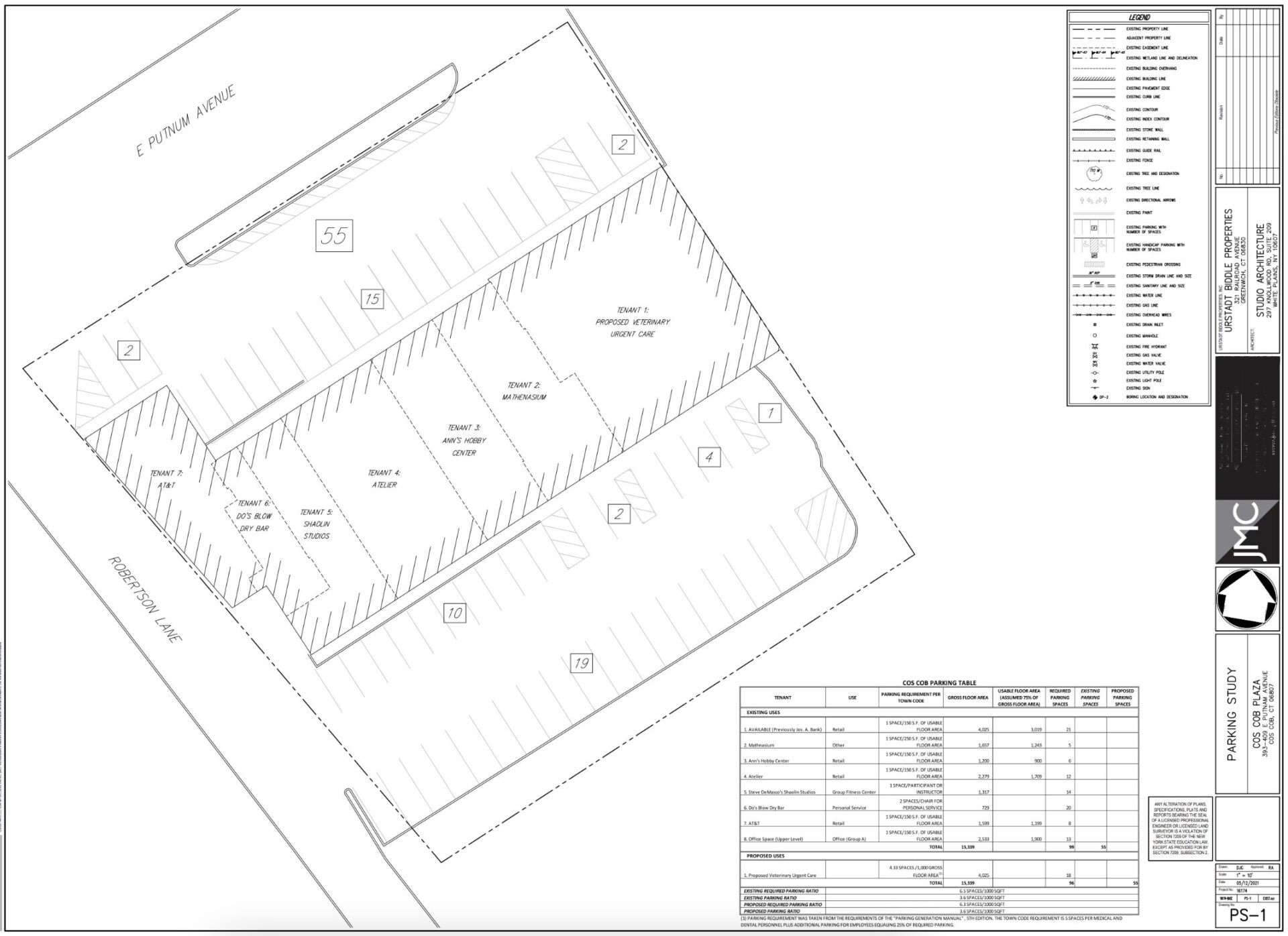 As reflected in the parking study, Cos Cob Plaza has 55 parking spaces. The application narrative says a change in use of the consolidated space to restaurant would significantly reduce the required number of required parking spaces under § 6-158 of the Building Zone Regulations.