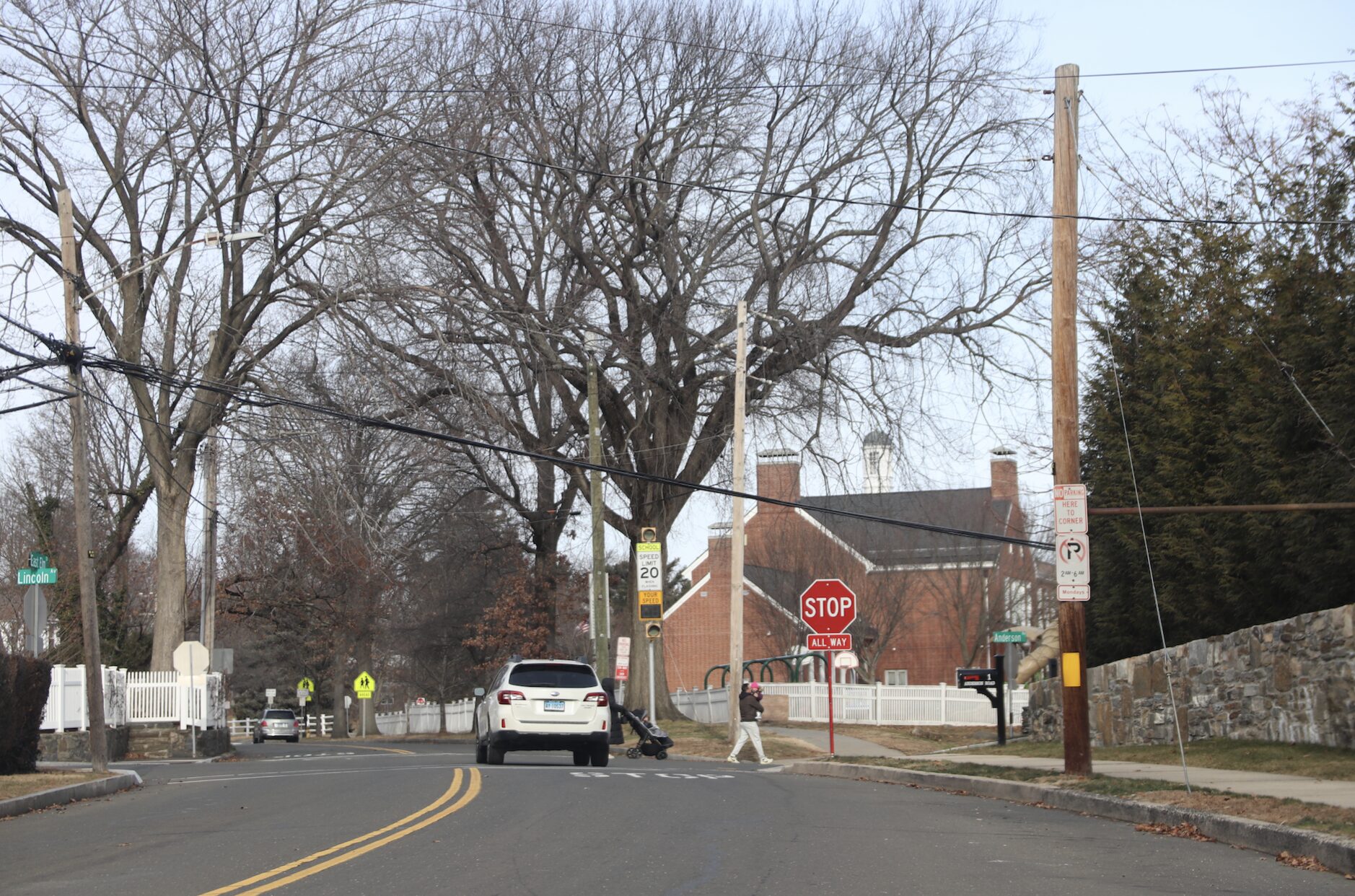 View of East Elm Street and Julian Curtiss School in background at the four way stop at intersection of Lincoln and Anderson.