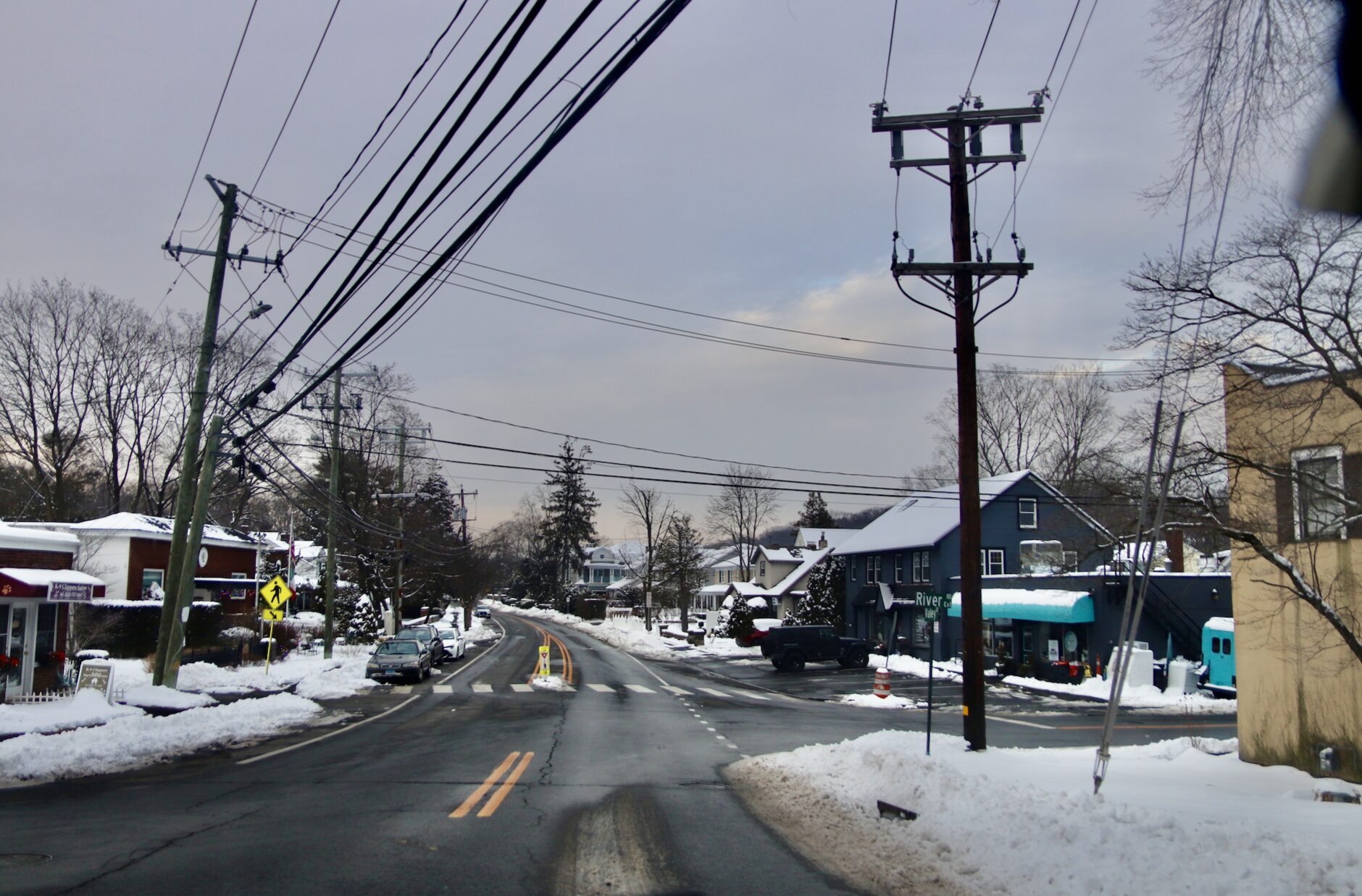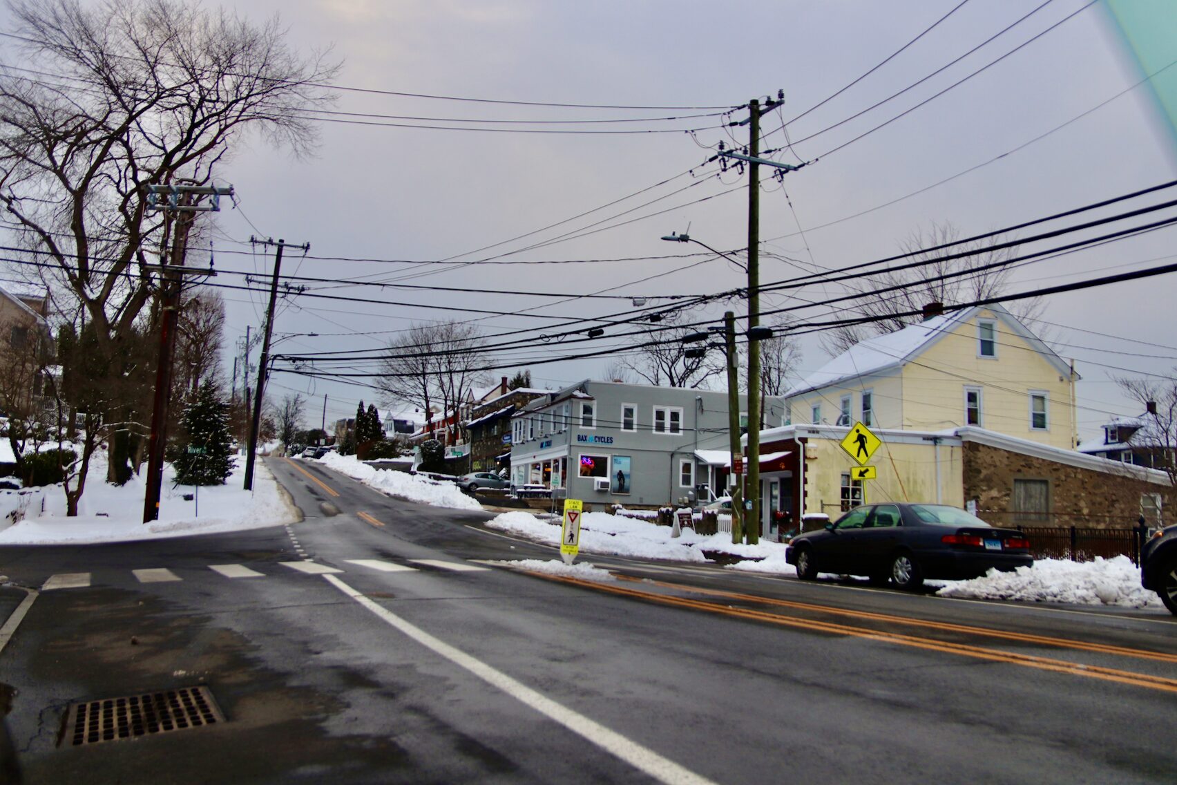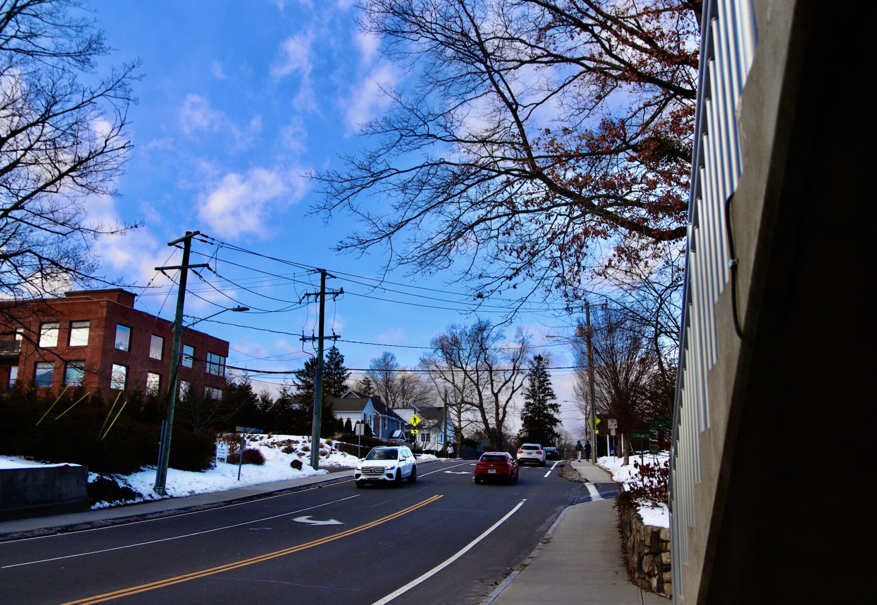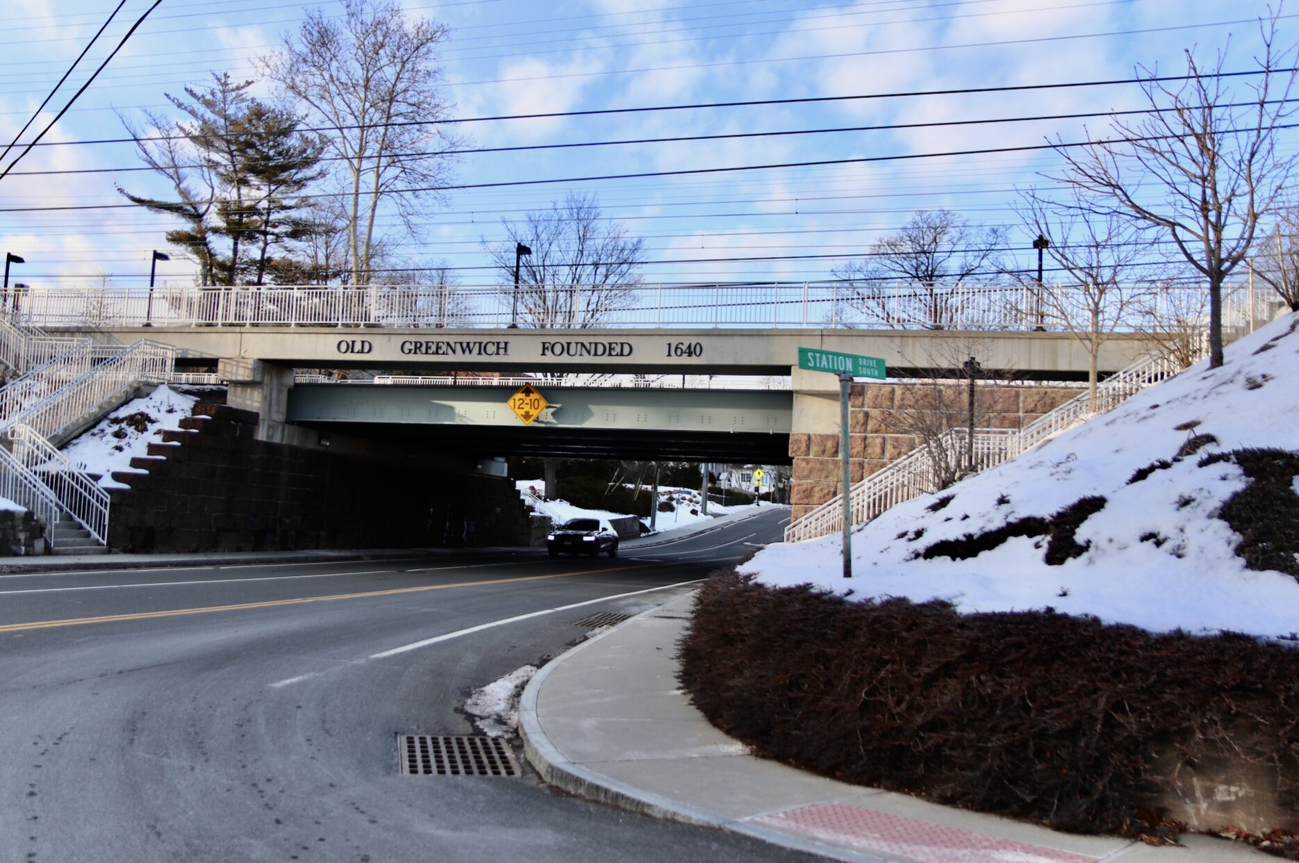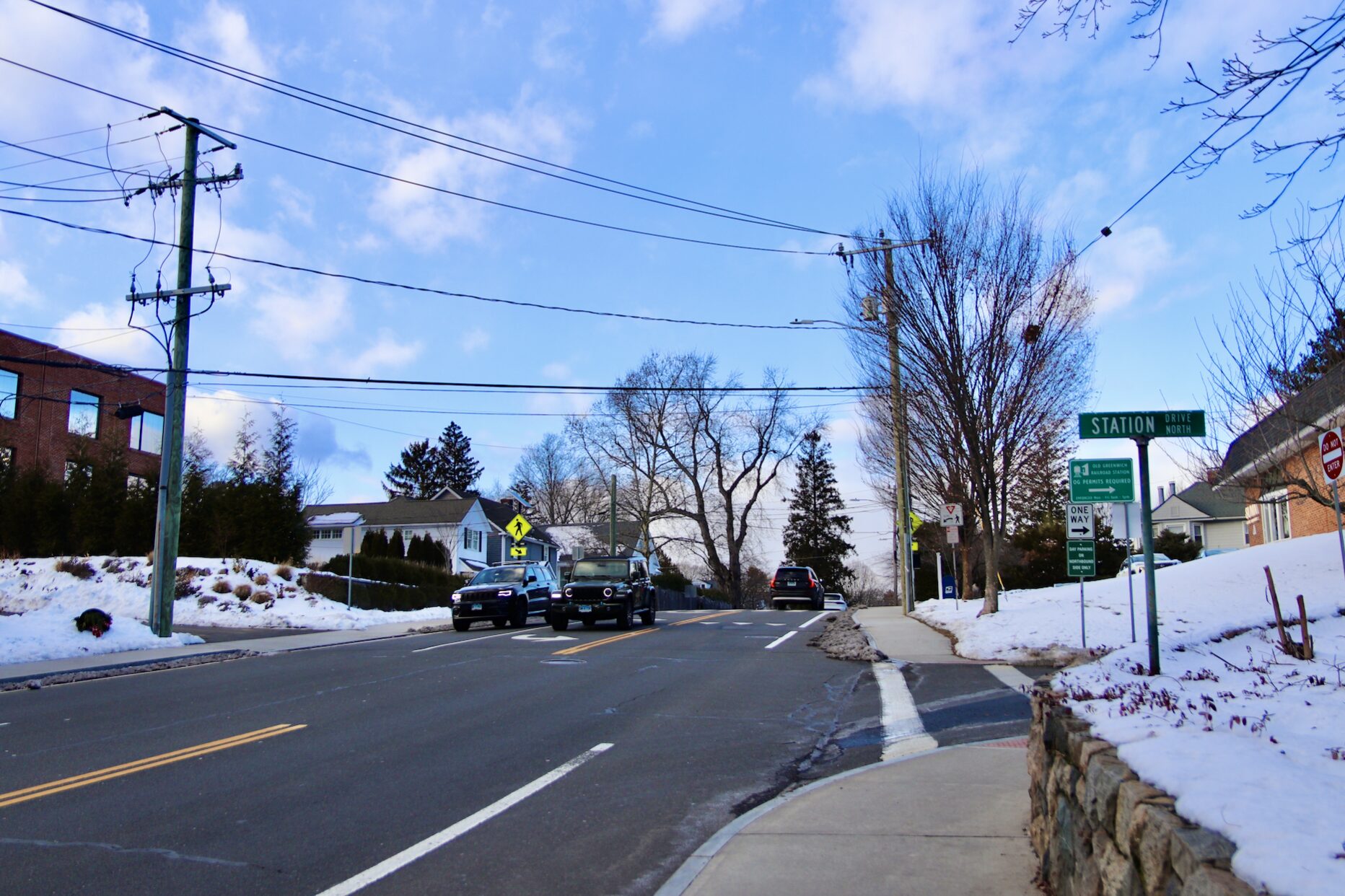 Looking north on Sound Beach Ave in Old Greenwich toward crosswalk to Station Drive North. Dec 30, 2025
