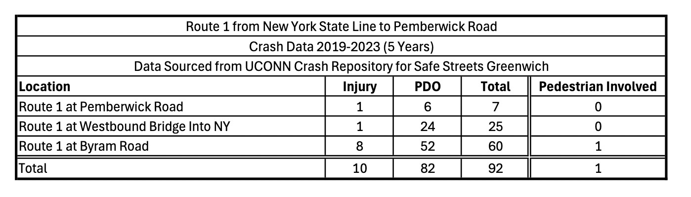 Five years of crash data is included in the agenda packet, with the most occurring in the area of Rte 1 at Byram Road.
