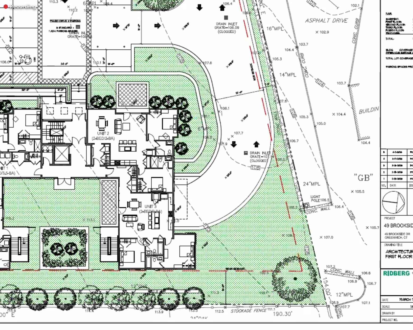 At the last Greenwich Planning & Zoning commission meeting Vale Blossom LLC based in Dallas, Texas, presented a first look at a four-story apartment building with 9 units built at 49 Brookside Drive, which has been an overflow parking lot for Acme (previously A&P). According to the pre-application narrative, the lease between the owners of the Acme property and the owner of 49 Brookside Drive expired last year.