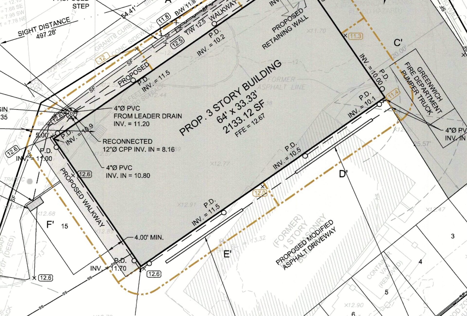 Enlarged: The three story building is proposed to be in the area in front of the former 1 story building at 121 East Putnam Ave in Cos Cob.