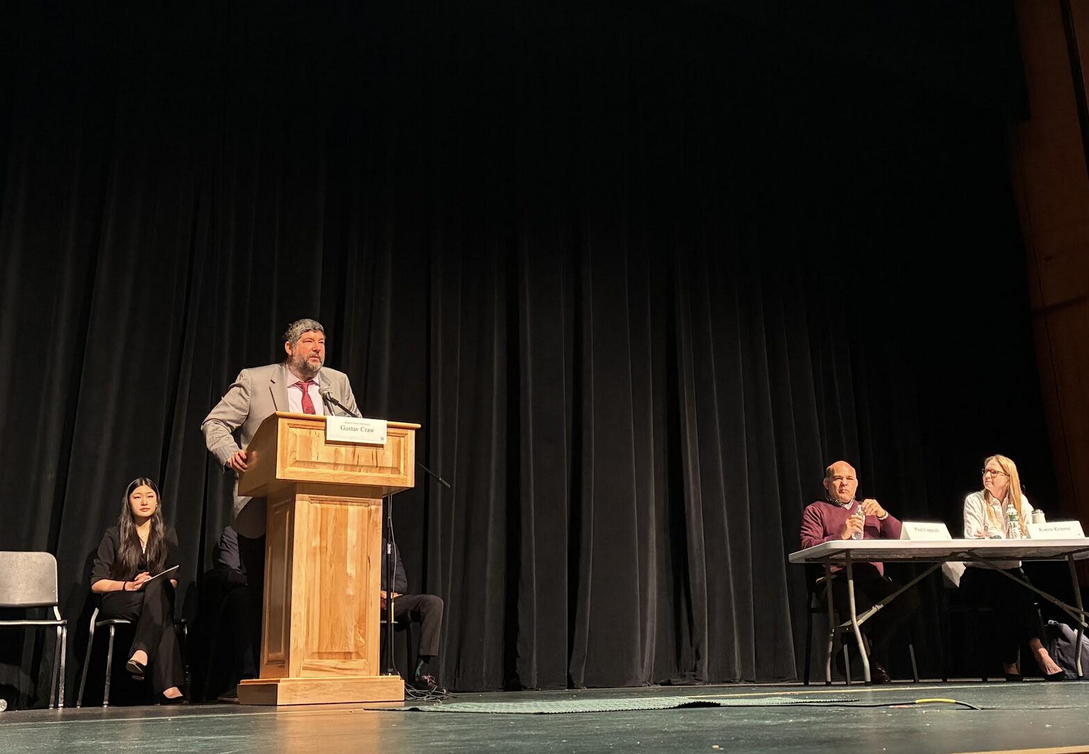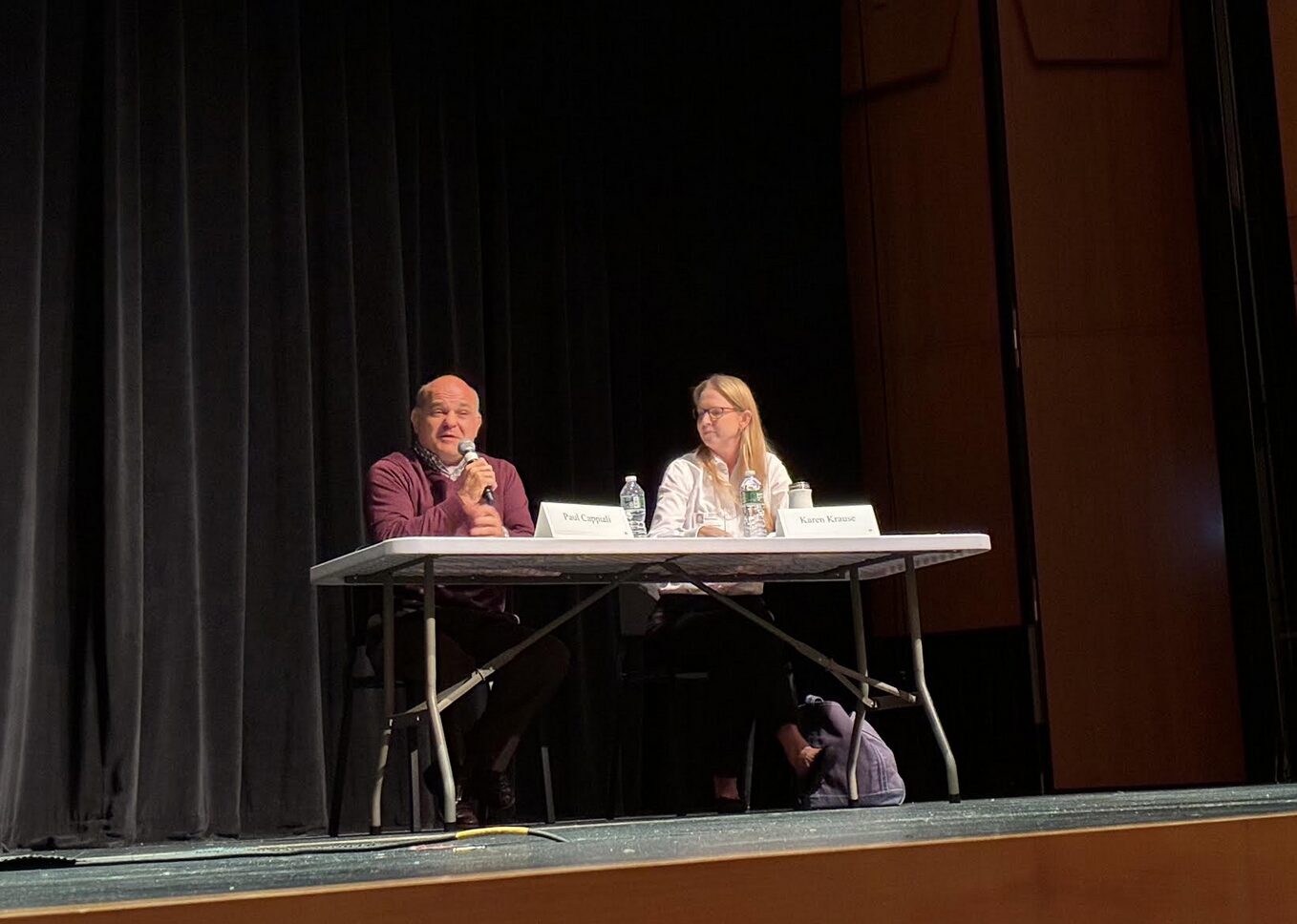 Republican candidates Paul Cappiali and Karen Krause at the GHS “We the People” debates. Oct 9, 2025 Photo: Leslie Yager