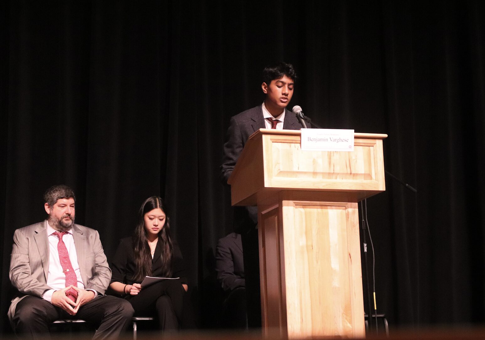 Greenwich High School “We The People” team member Benjamin Varghese directs a question at candidates in the BOE debate. Oct 9, 2025 Photo: Leslie Yager
