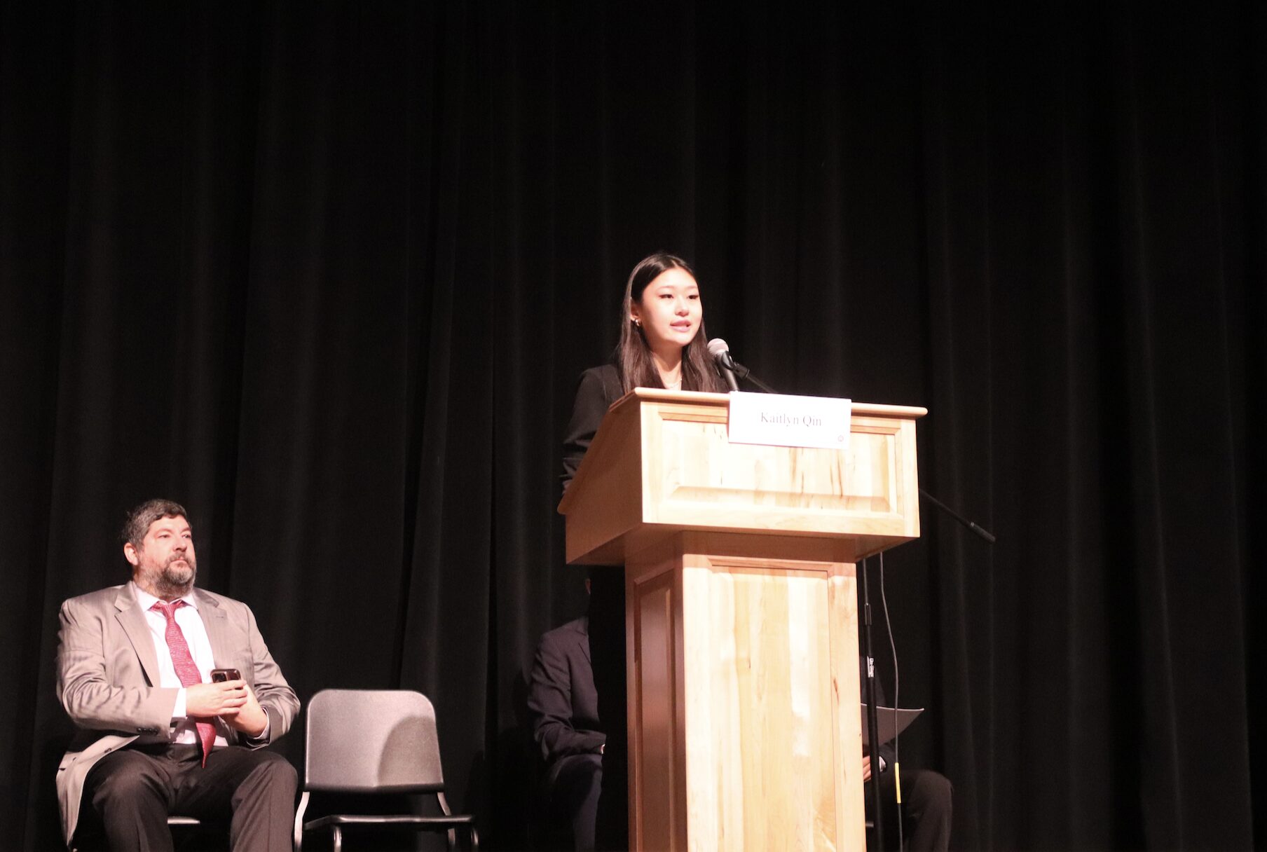 Greenwich High School “We The People” team member Kaitlin Qin directs a question at candidates in the BOE debate. Oct 9, 2025 Photo: Leslie Yager