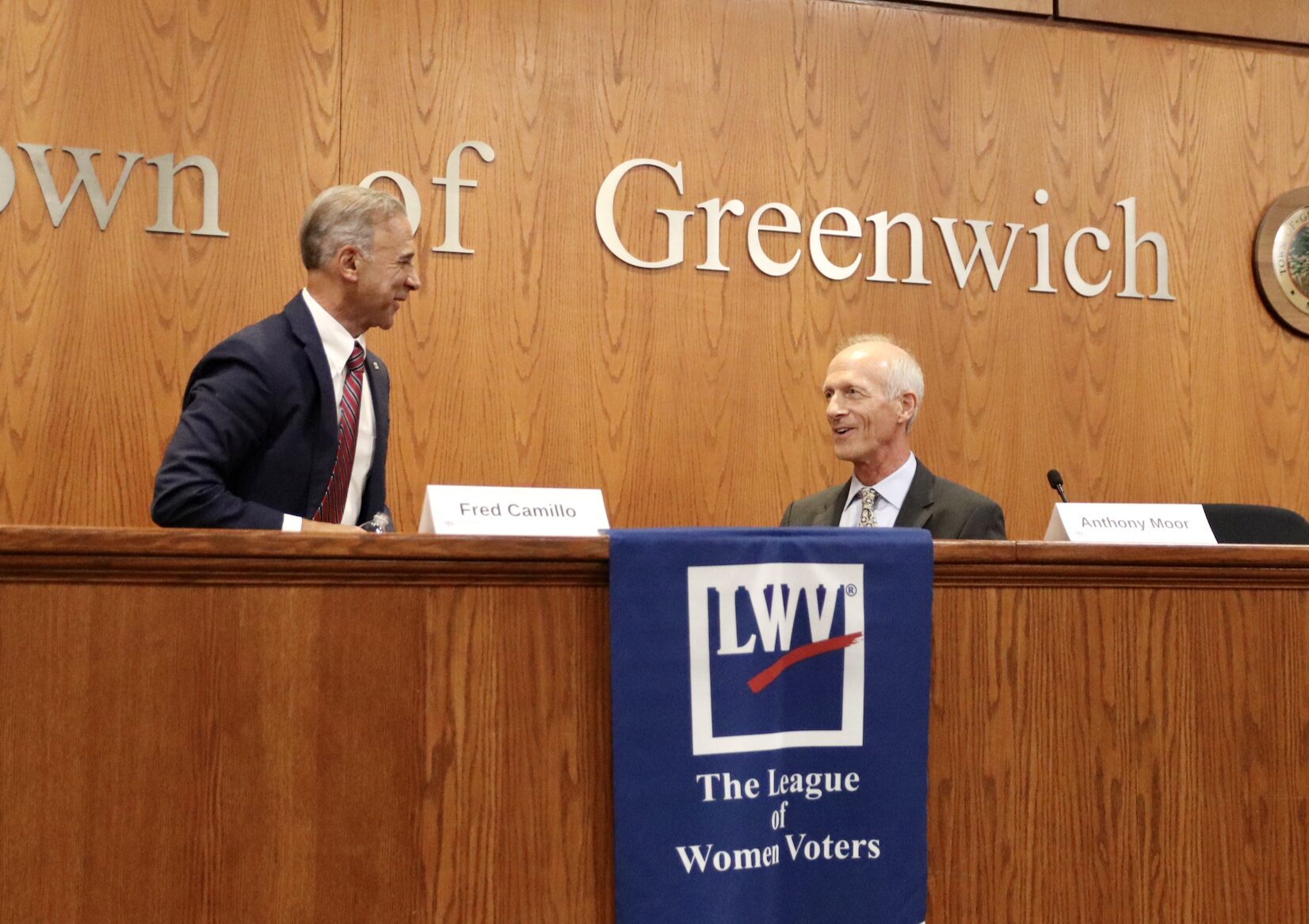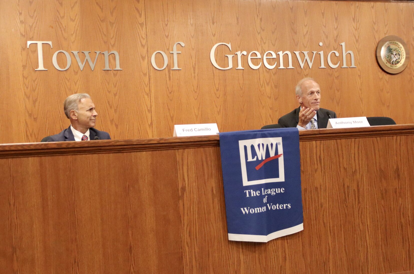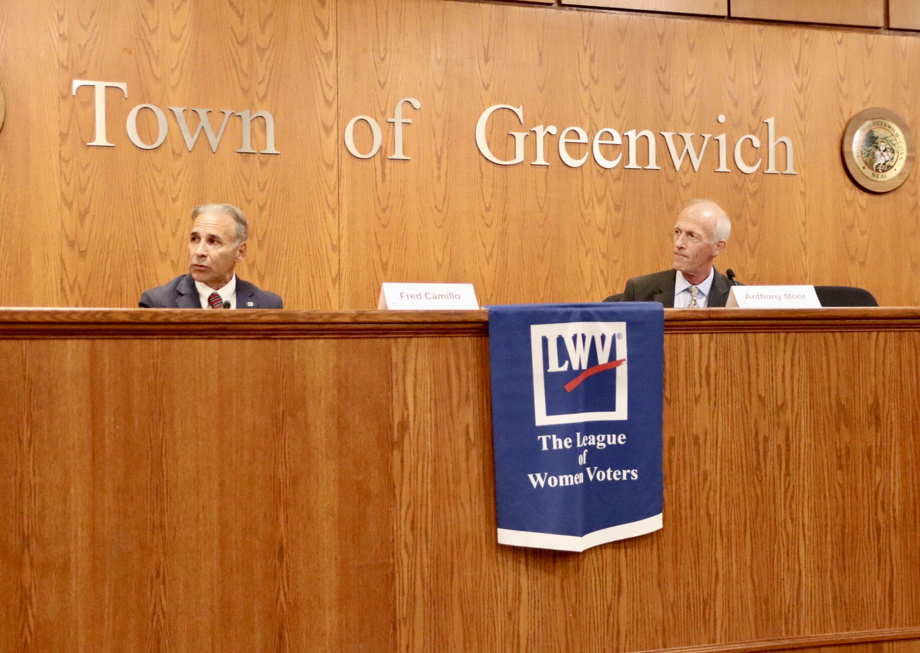 Incumbent Republican Fred Camillo, who seeks a fourth 2-year term as Greenwich’s First Selectman, debated Democratic candidate Anthony Moor.