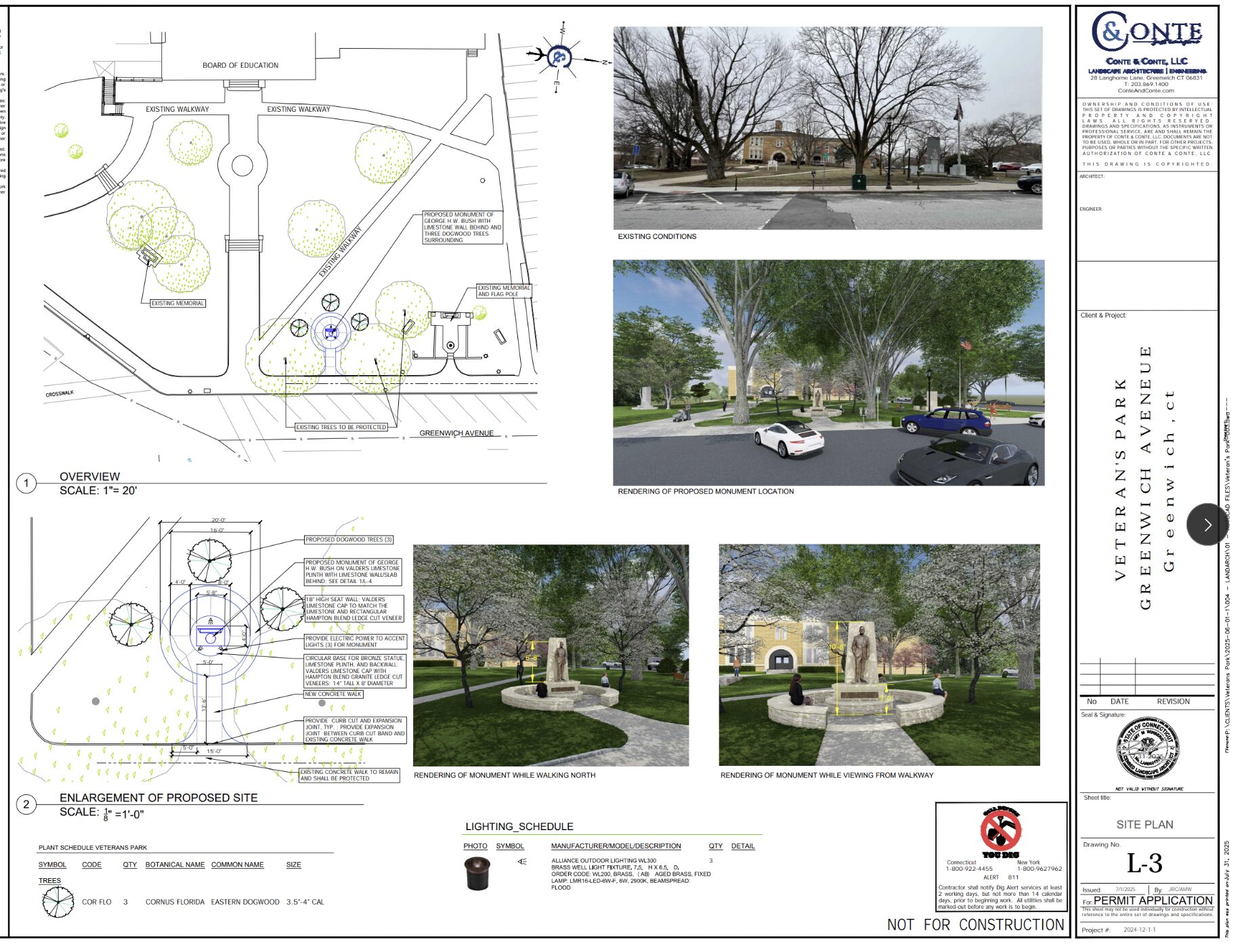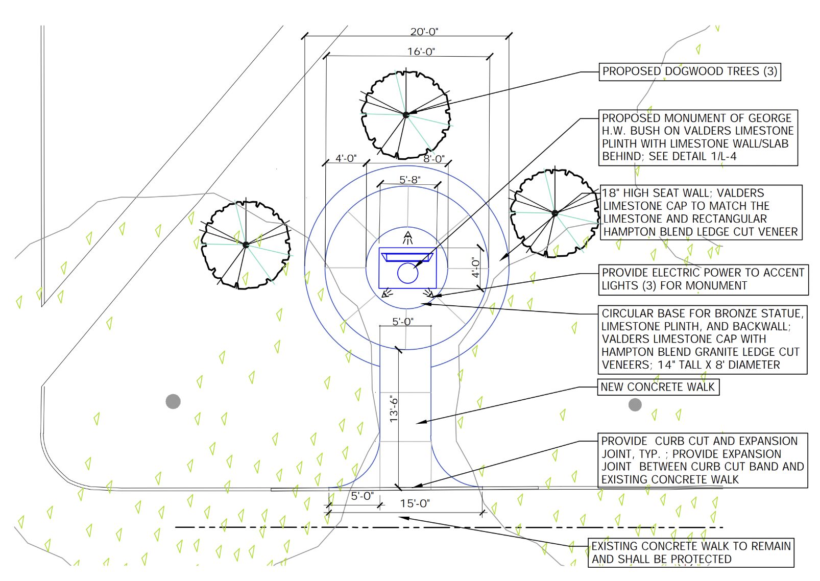 Site Plan for Illuminated George HW Bush Statue with Seating Wall Outside Havemeyer Building Submitted to P&Z