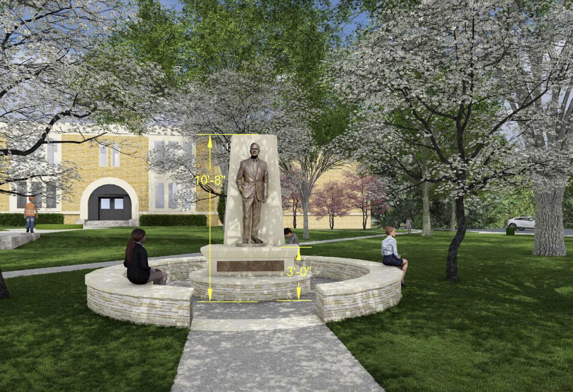 A circular seating wall would be granite, with a limestone monolith (5 ft wide and 7 ft 8″ high) framing the statute.