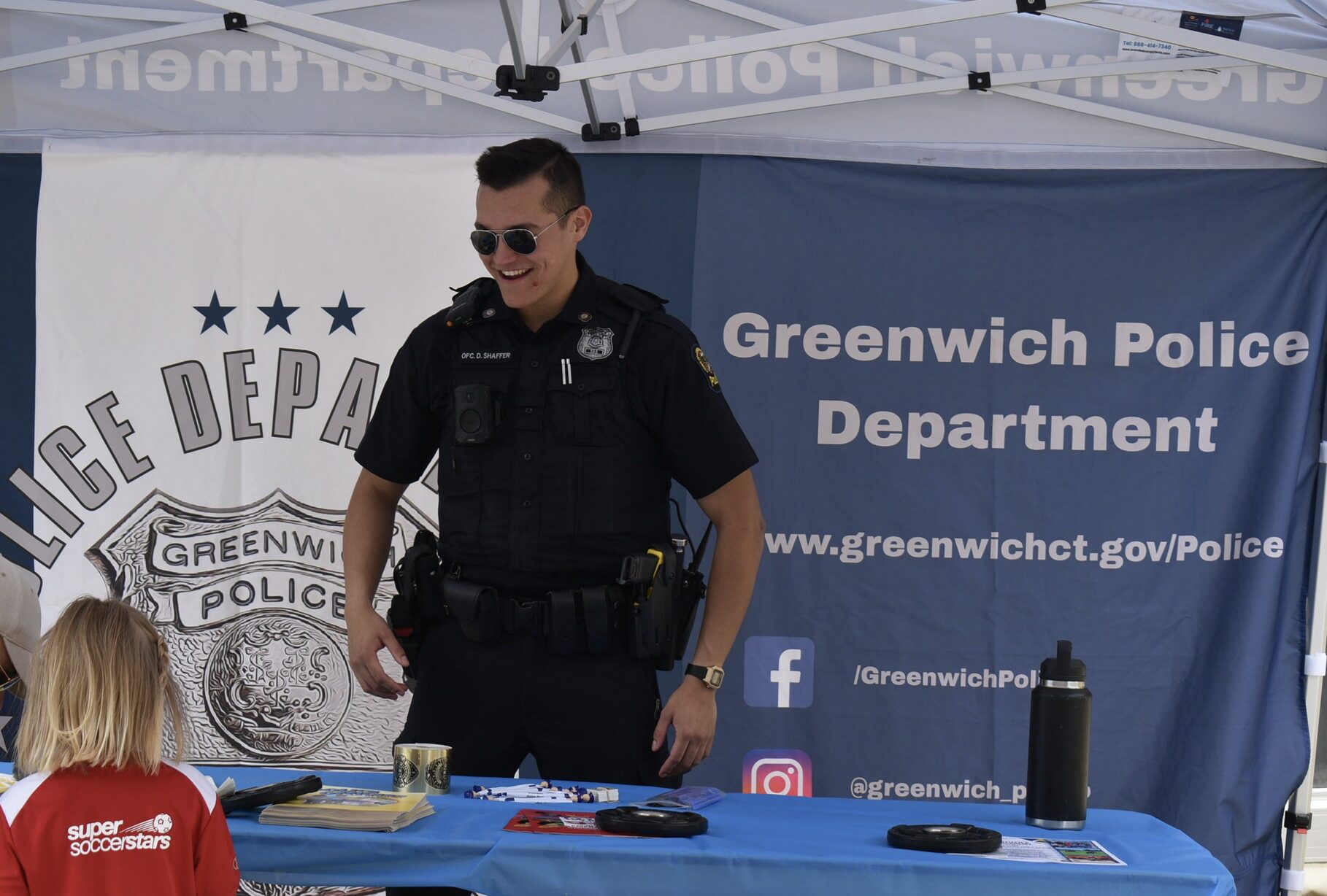 Greenwich Police held their annual “Police Day” event on Saturday, May 10, 2025. Pictured, officer Schaffer chats with a young resident. Photo: John Mastracchio