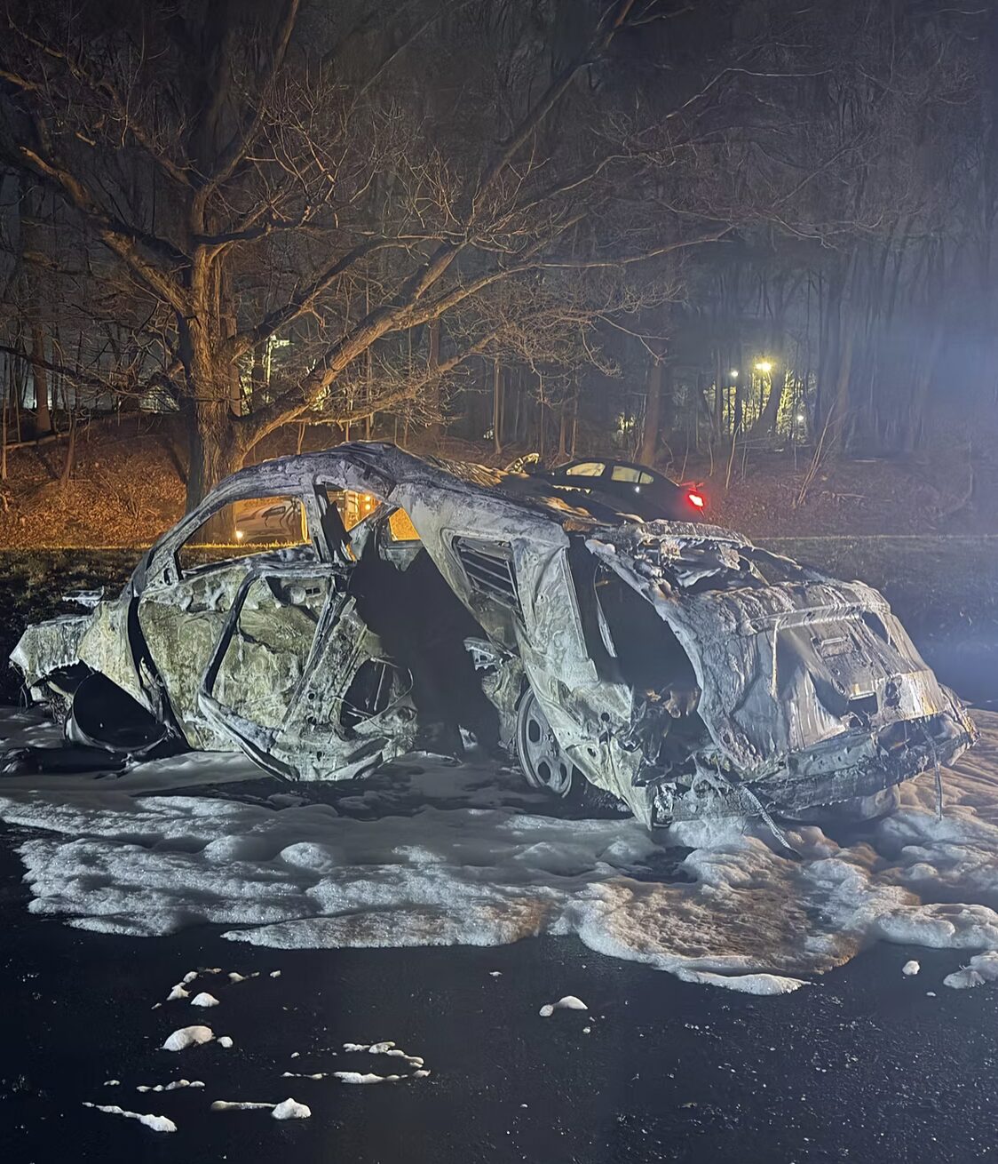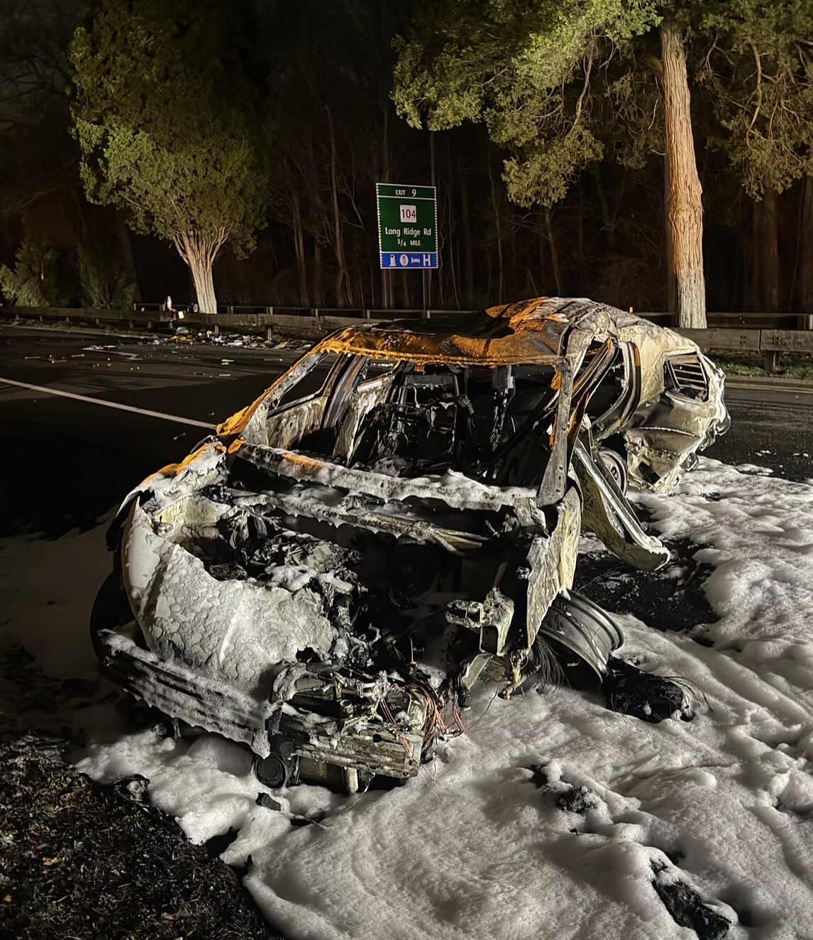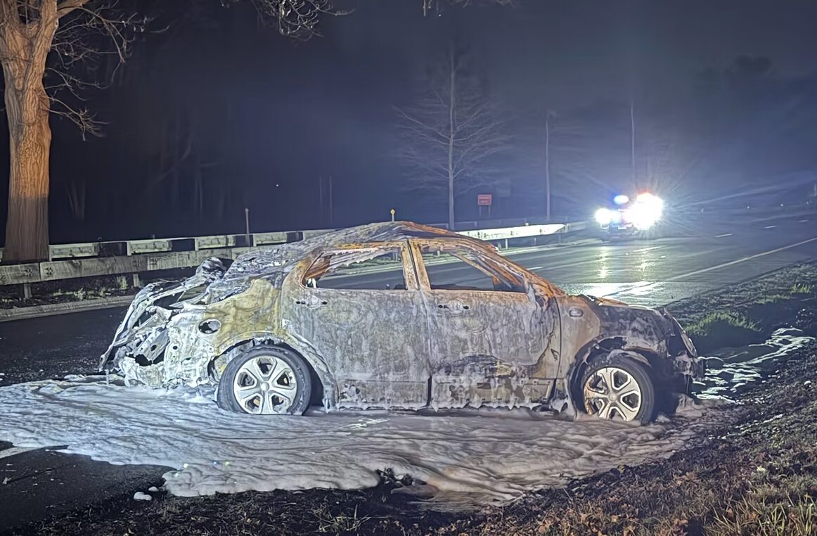 After troopers set up a pattern to close Route 15 for an investigation of a fatal collision, a driver sped through the flare pattern and struck a state police cruiser, which immediately burst into flames. March 31, 2026 Photo CT State Police