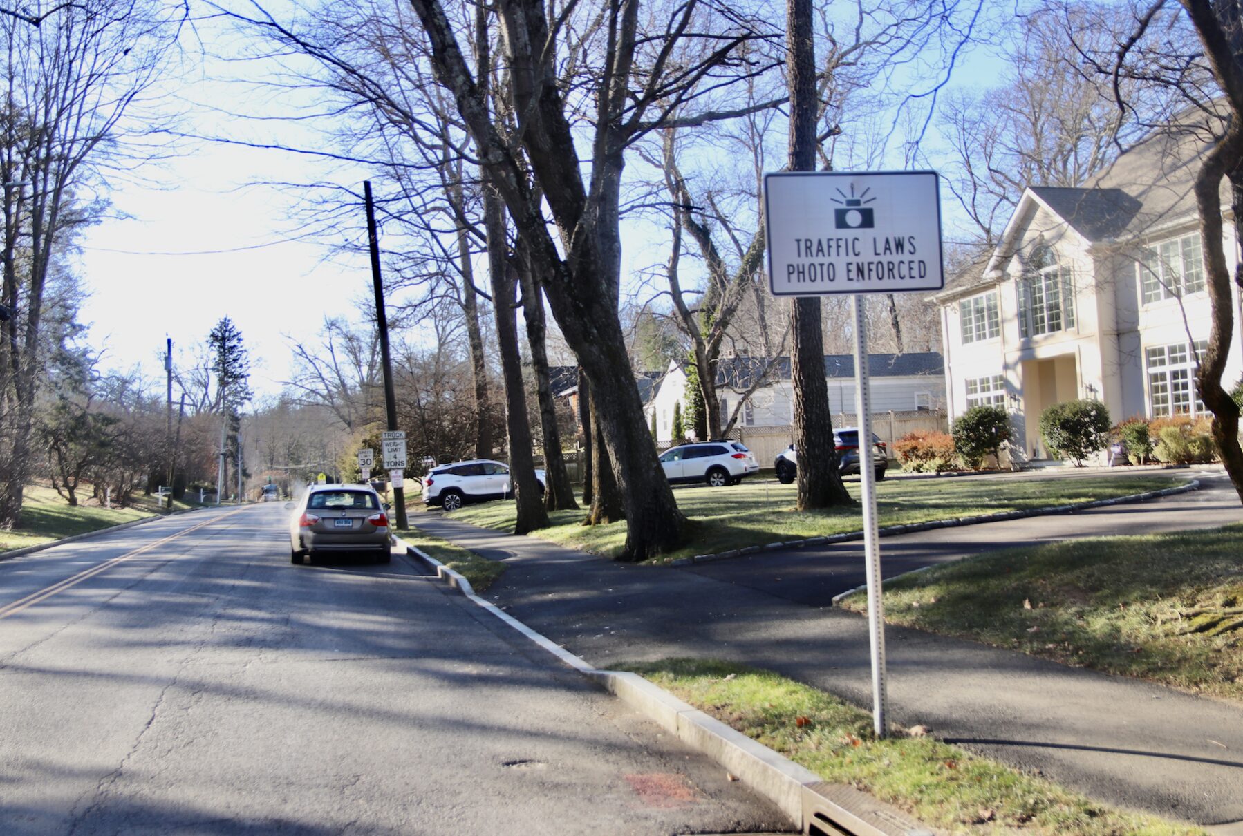 New signage on Hillside Road reflects that the photo speed enforcement program has expanded to include the Greenwich High School zone. Dec 9, 2025 Photo: Leslie Yager